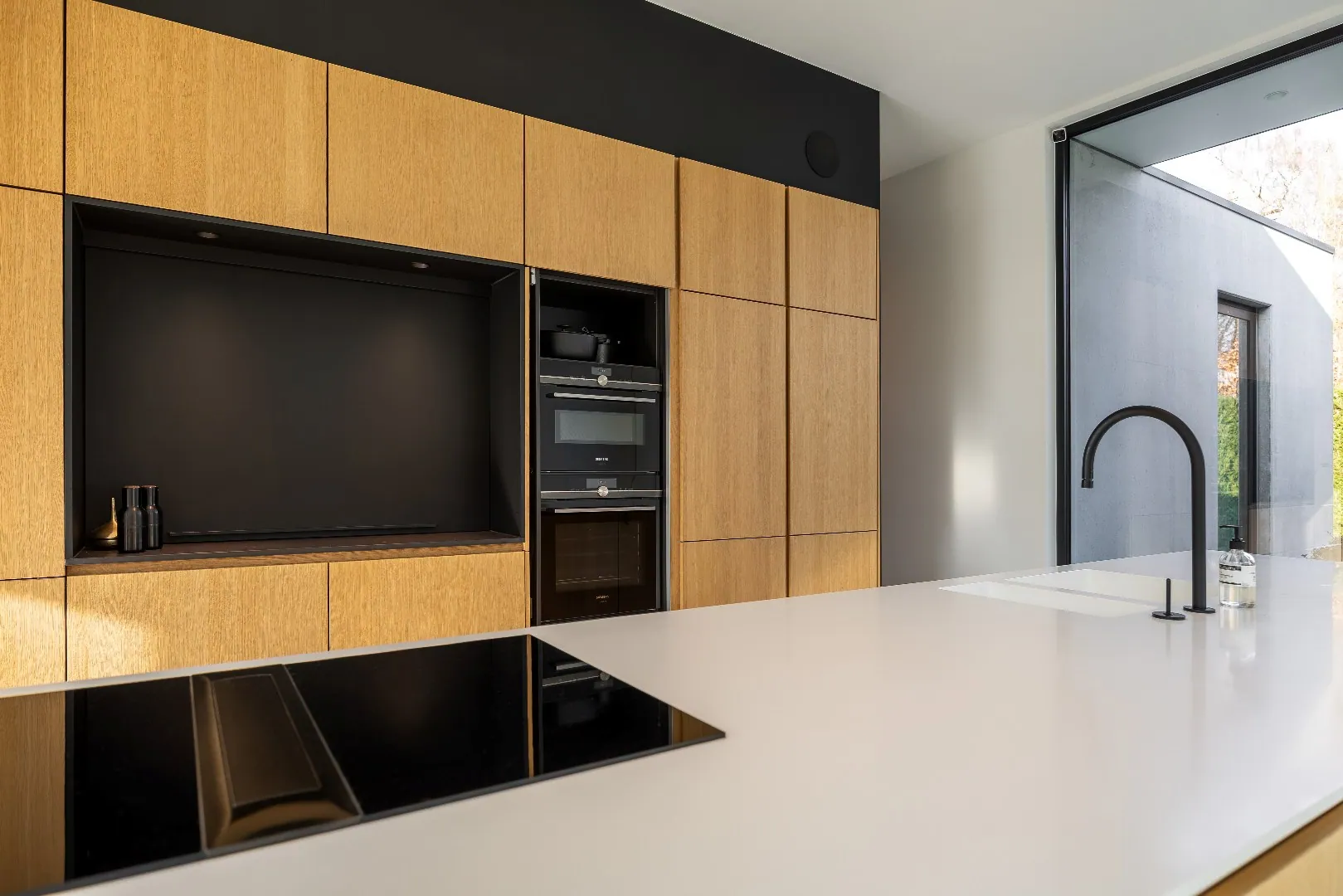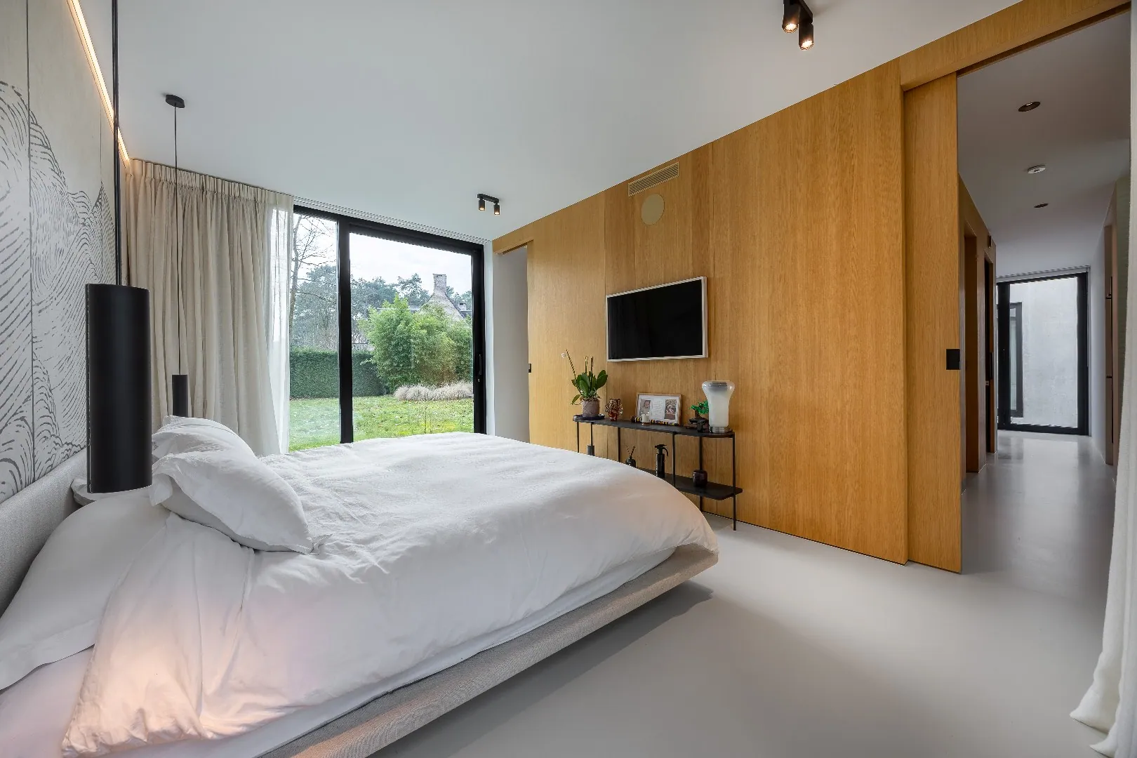 Aansluitend bereikt u via een schuifdeur de veelzijdige bureau- of tv-ruimte met zicht op en toegang tot de binnentuin — ideaal voor werken in alle rust of ontspannen momenten met het gezin.