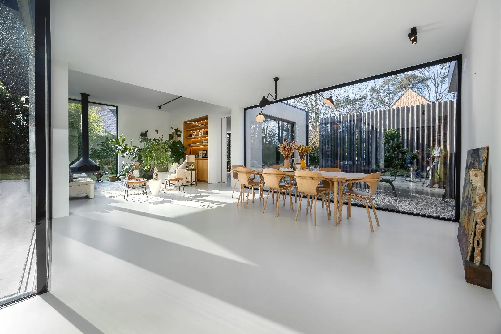 Bij het binnenkomen wordt u ontvangen in een elegante inkomhal met een prachtige vestiaire. De royale leefruimte baadt in het licht dankzij de indrukwekkende raampartijen die naadloos uitkijken op de fraai aangelegde tuin. De hangende houthaard vormt het warme, sfeervolle middelpunt van deze ruimte.