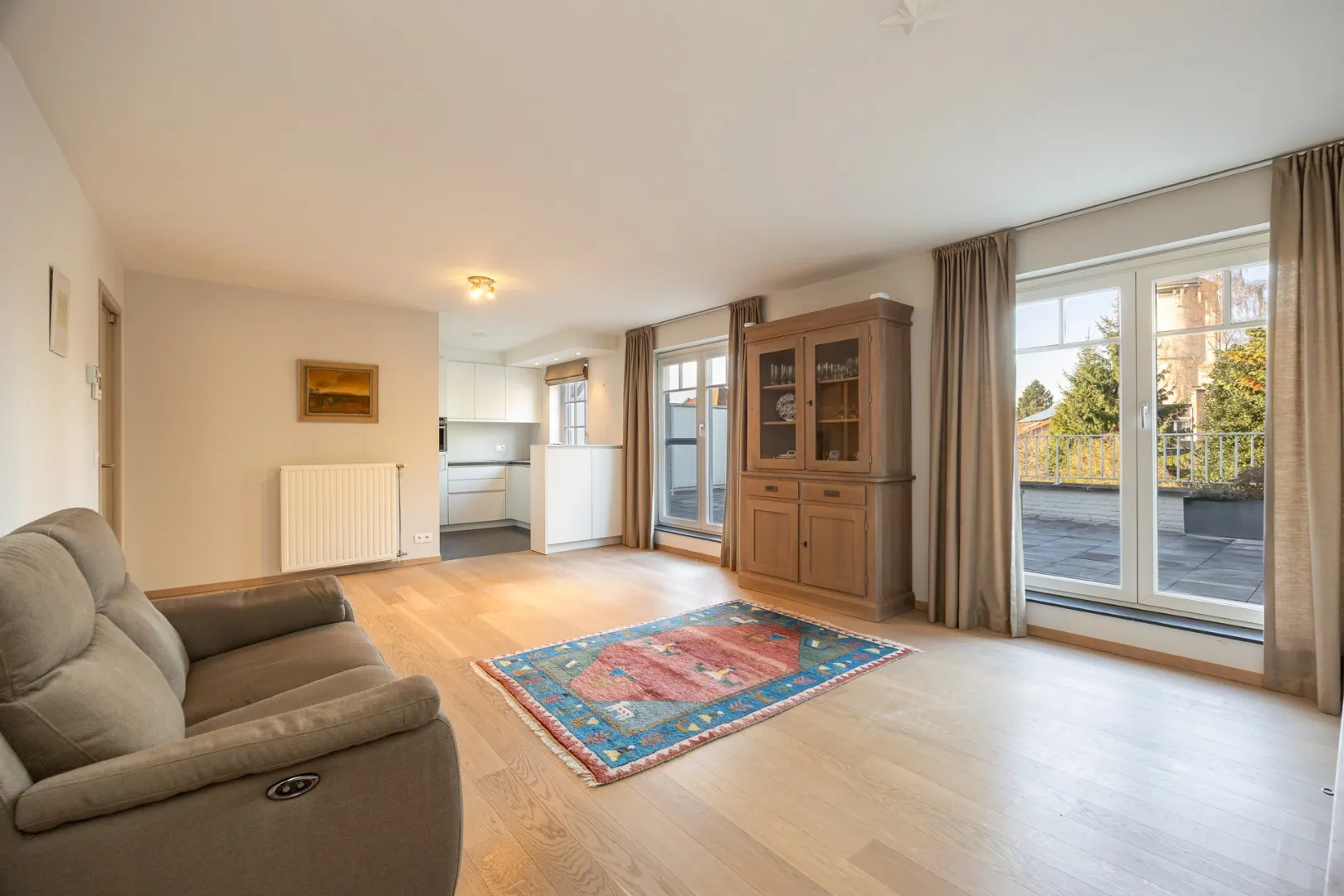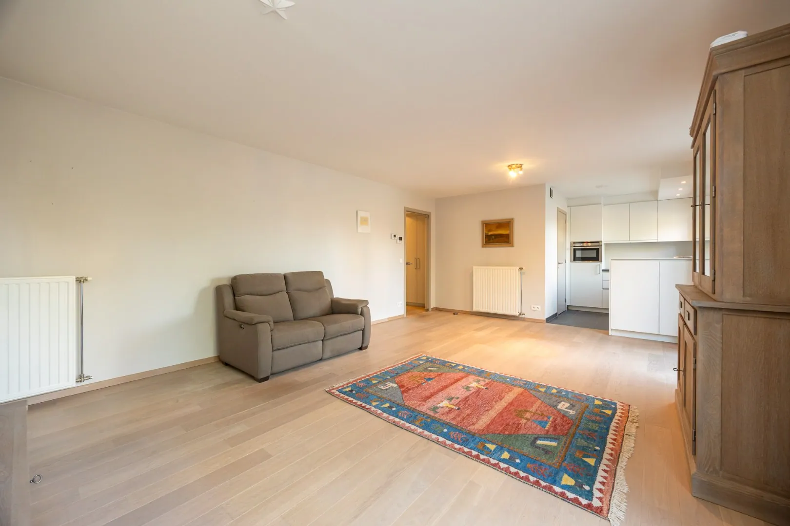 Achteraan het appartement bevindt zich de ruime leefruimte met open keuken, die zorgt voor een aangenaam en open gevoel. De keuken is volledig uitgerust met alle nodige toestellen en beschikt daarnaast over een praktische berging/wasplaats.