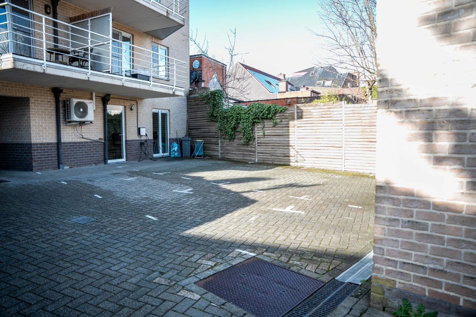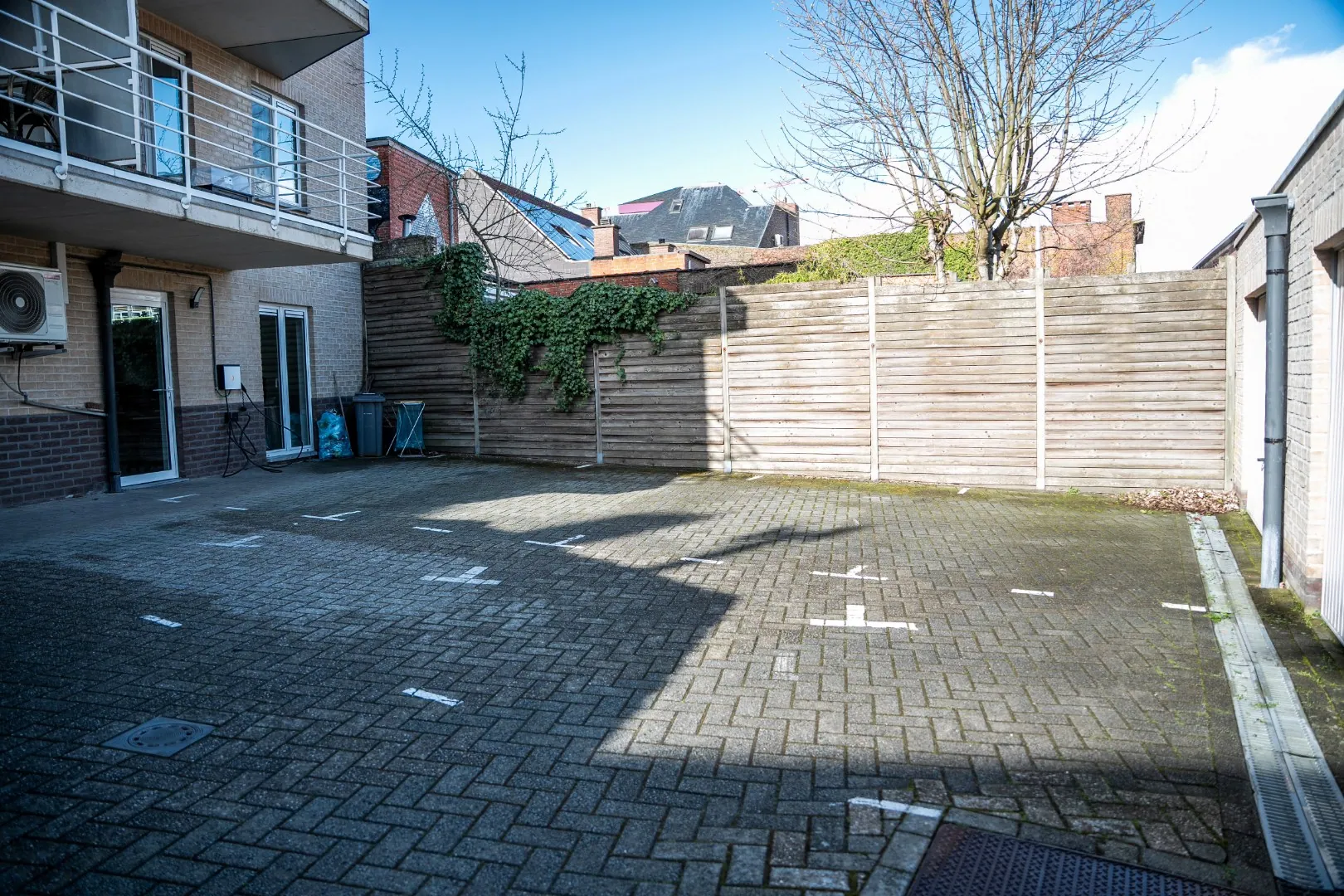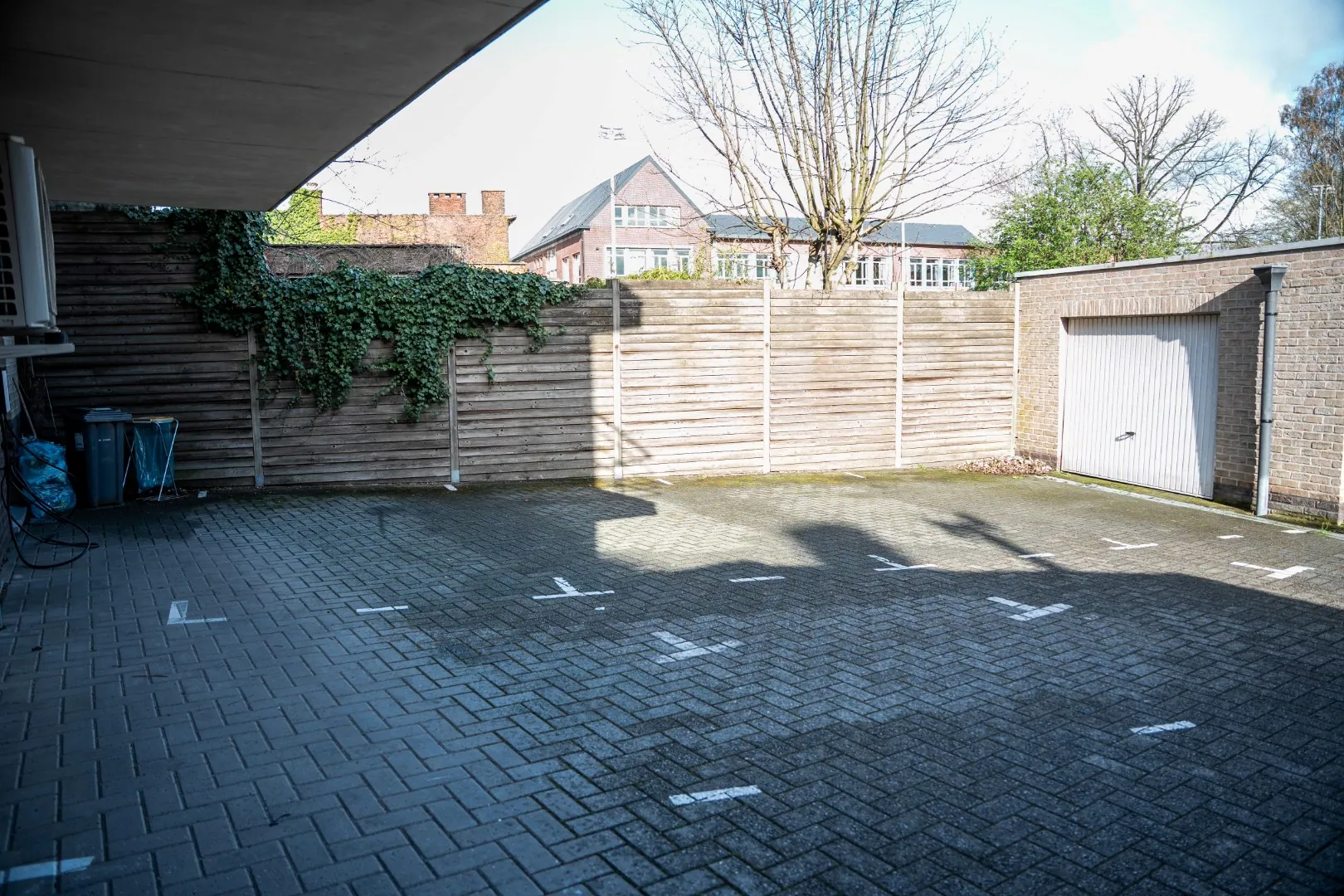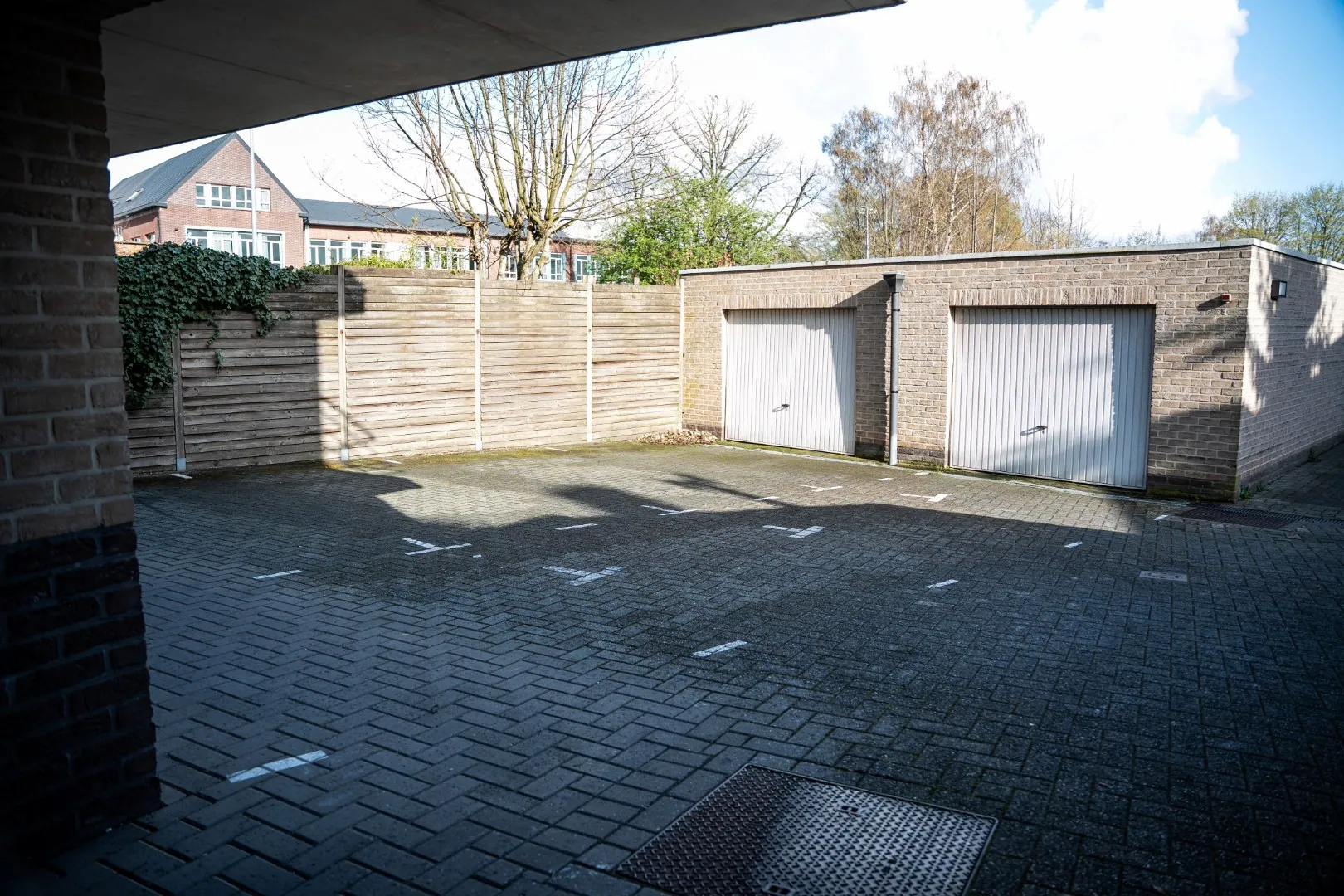 Achteraan bevinden zich twee garages en 2 staanplaatsen.