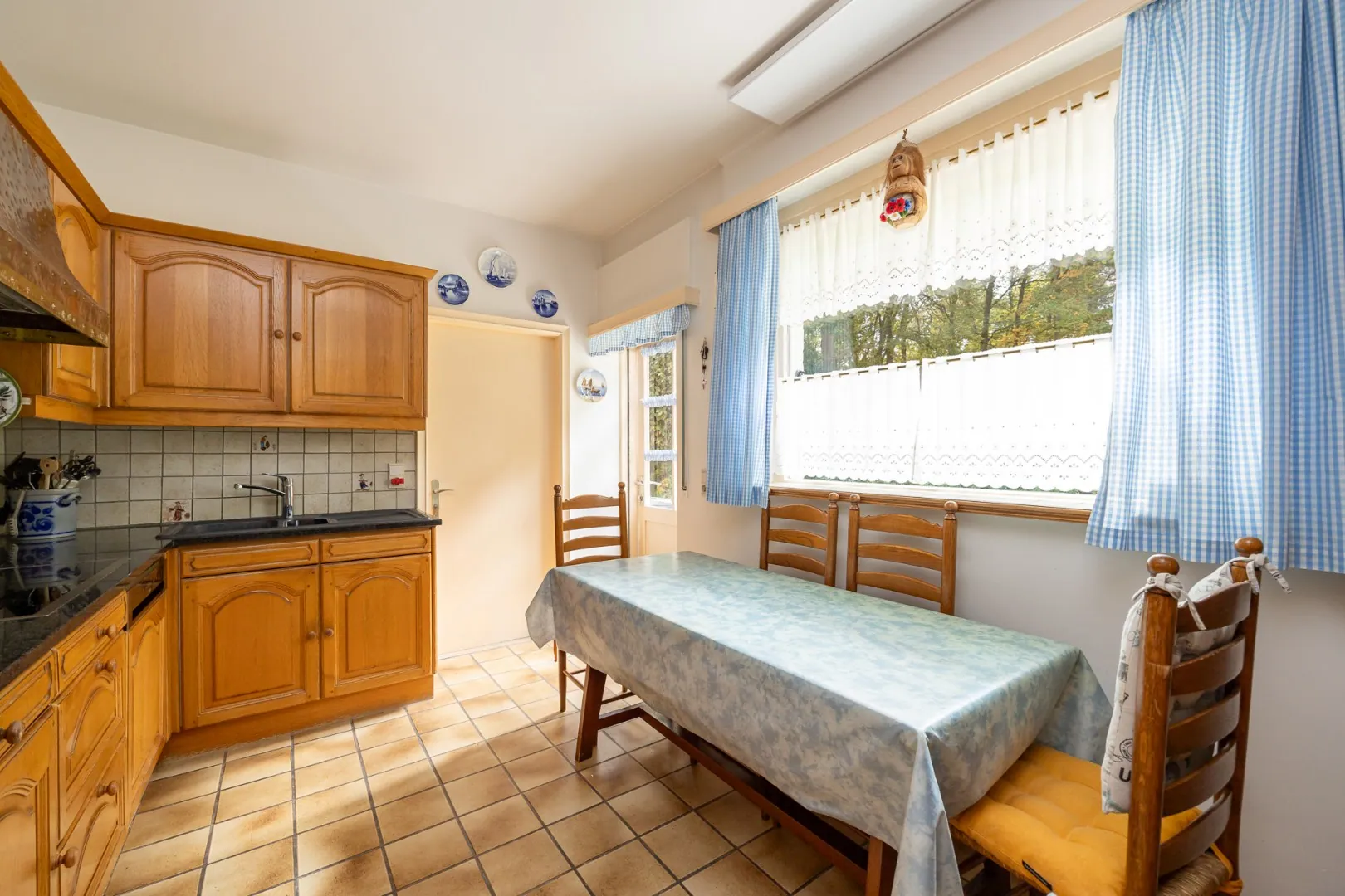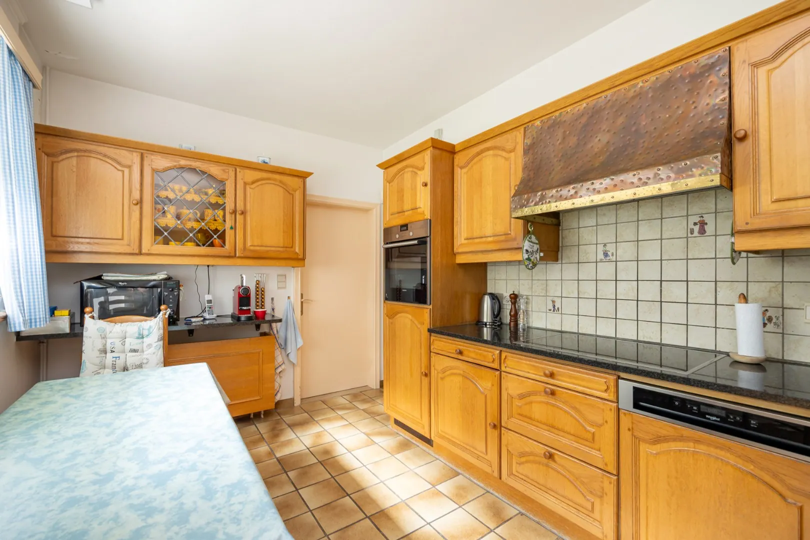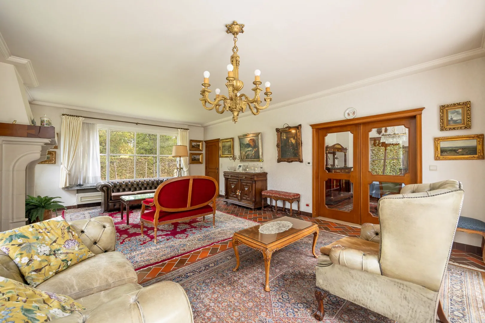 Een statige inkomhal verwelkomt u en biedt toegang tot de vestiaire en het gastentoilet met handenwasser. De ruime woonkamer met open haard vormt het hart van de woning en sluit naadloos aan op de eetkamer, met zicht op de tuin. De keuken grenst aan de wasplaats en biedt toegang tot zowel de kelder als de dubbele inpandige garage — praktisch en comfortabel.