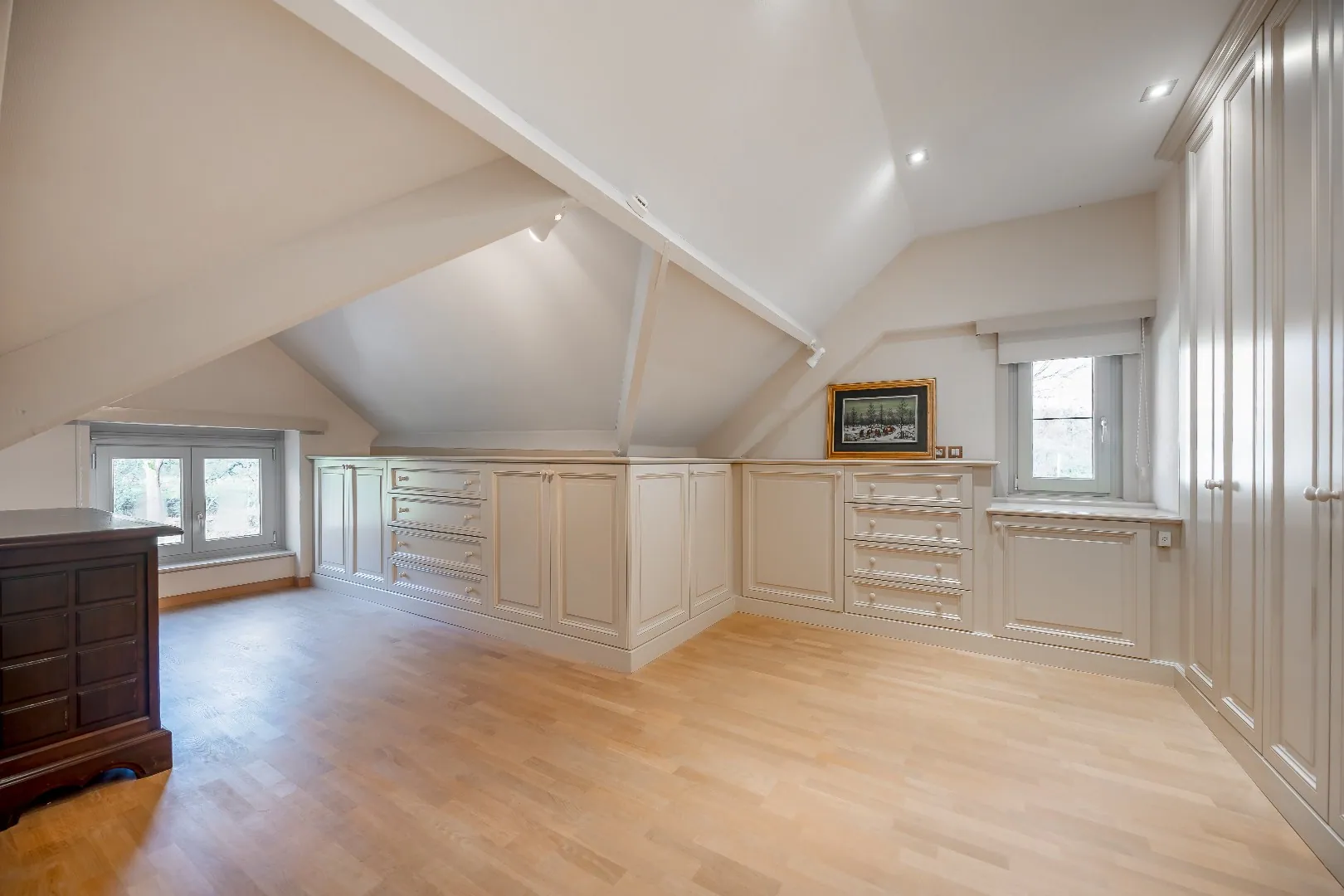 De verdieping omvat vier slaapkamers. Twee slaapkamers zijn momenteel met elkaar verbonden, maar kunnen ... eenvoudig opnieuw afzonderlijk gebruikt worden. De derde slaapkamer is bijzonder ruim en de master bedroom beschikt over een eigen badkamer met ligbad en douche, evenals een aparte dressing. De trappenhal is voorzien van ingemaakte kasten, wat zorgt voor een overvloed aan praktische bergruimte.