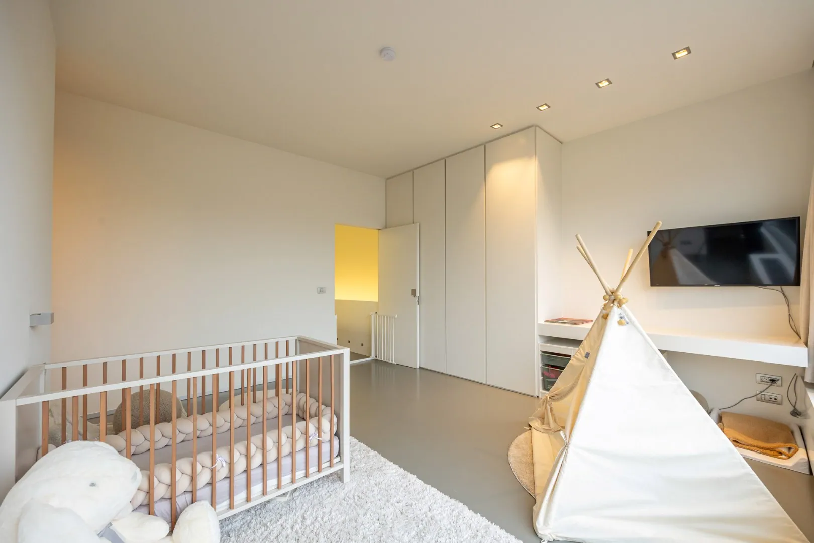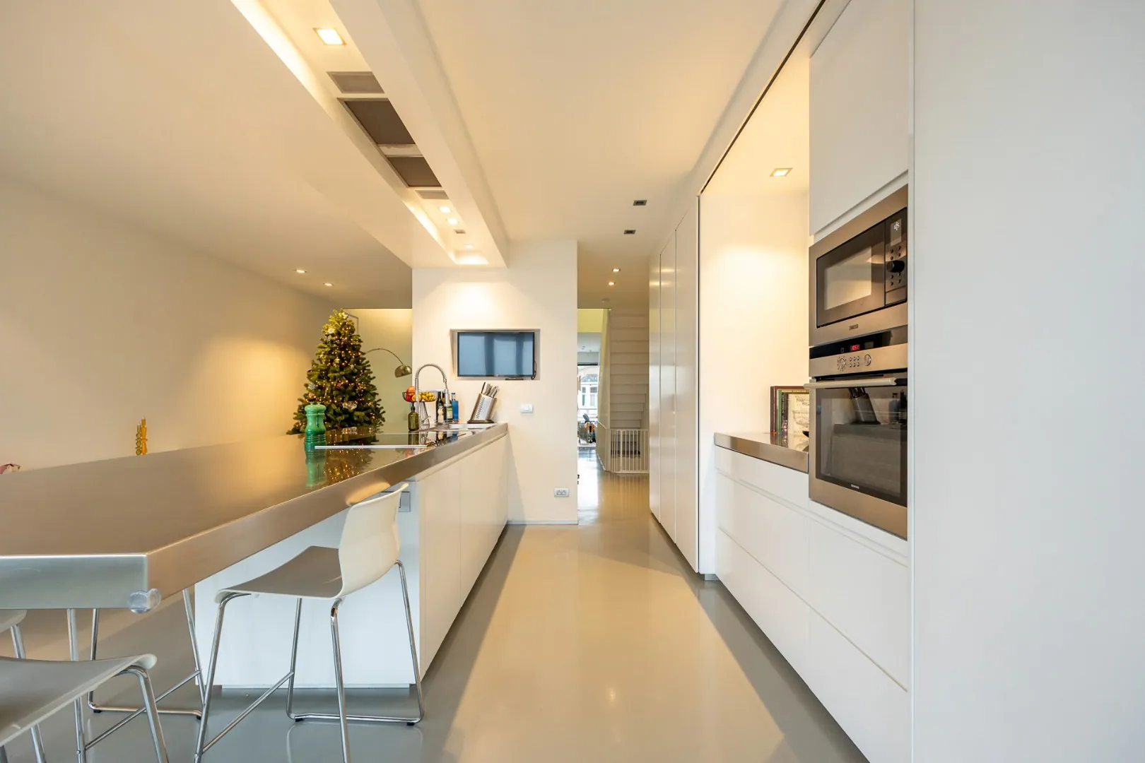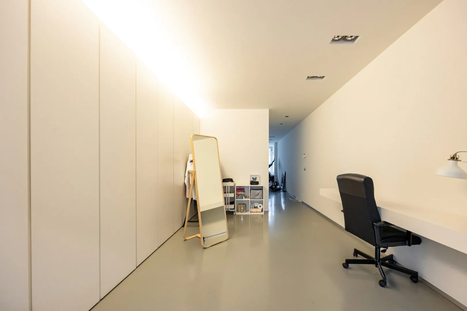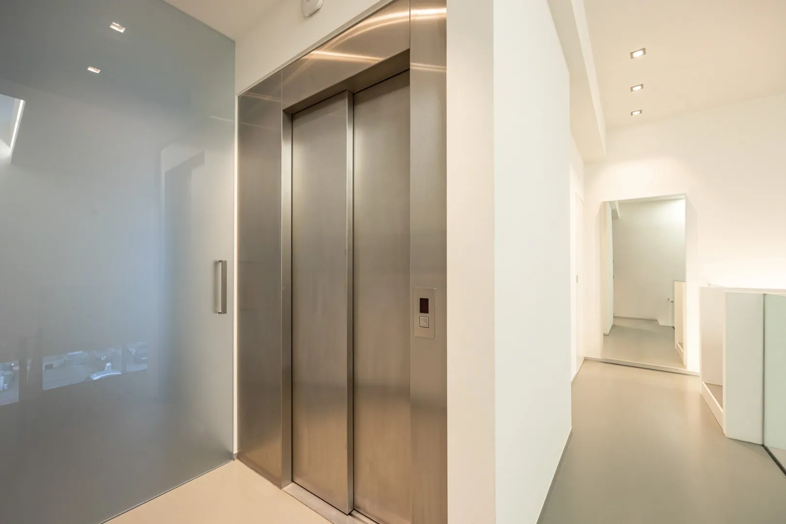 Op het gelijkvloers bevindt zich een ruime open ruimte, gescheiden door de liftkoker en een gastentoilet. Dankzij deze indeling is dit niveau ideaal voor een vrij beroep of (medische) praktijk. De strakke polyurethaan gietvloer en de ingewerkte maatkasten zorgen voor een stijlvolle uitstraling.