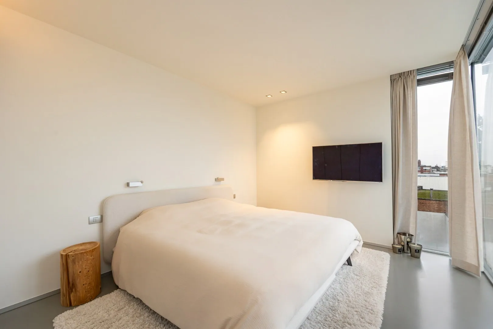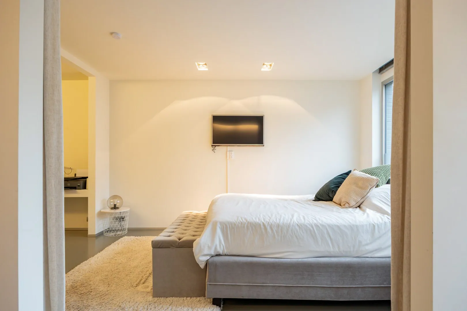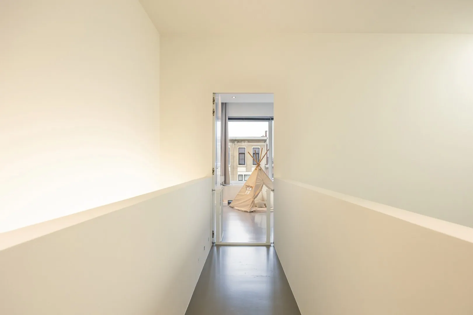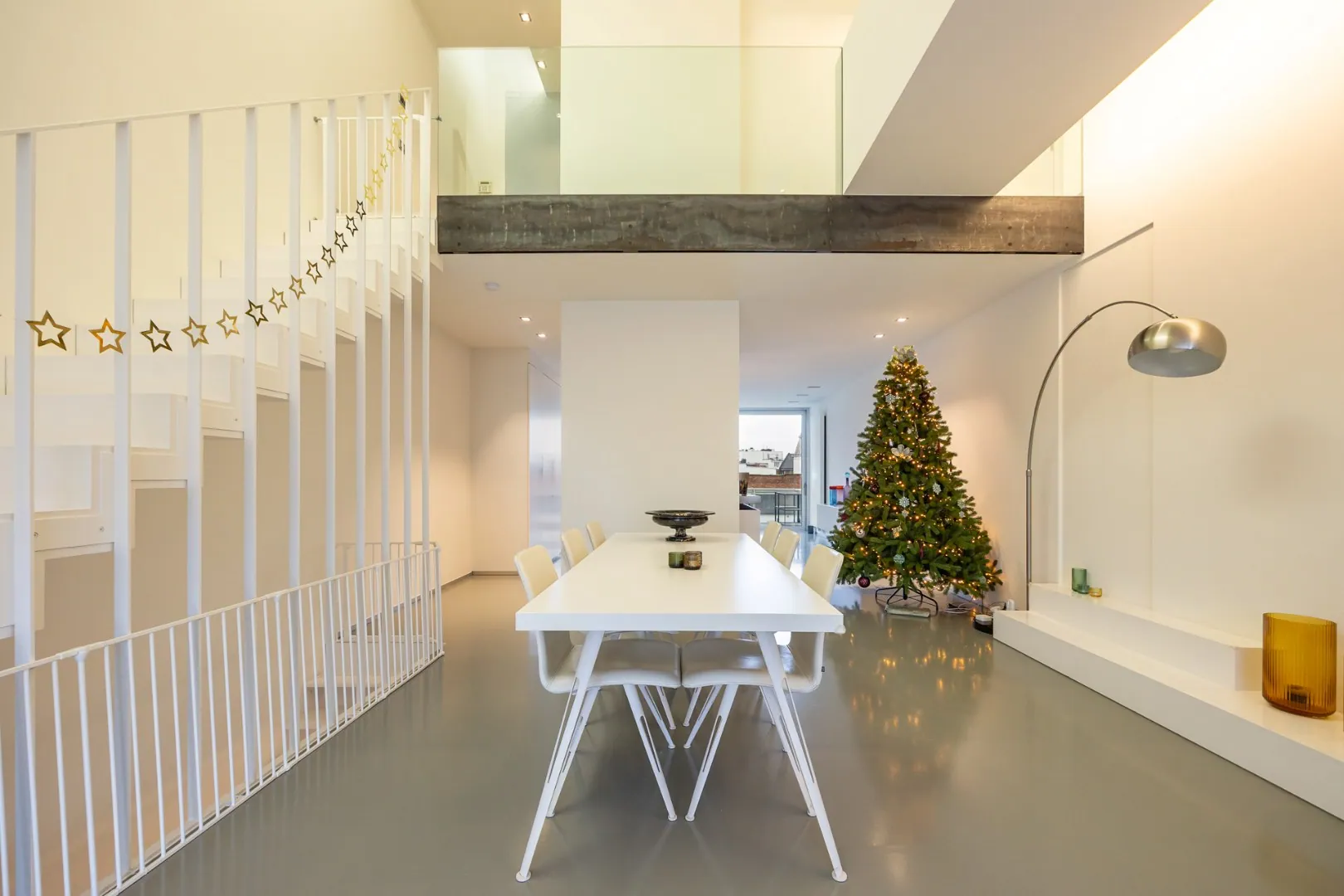 Op de tweede verdieping bevinden zich twee slaapkamers, waaronder een master bedroom met ruime dressing, tweede badkamer en toegang tot een privéterras. Een vide zorgt voor extra licht en een open gevoel.