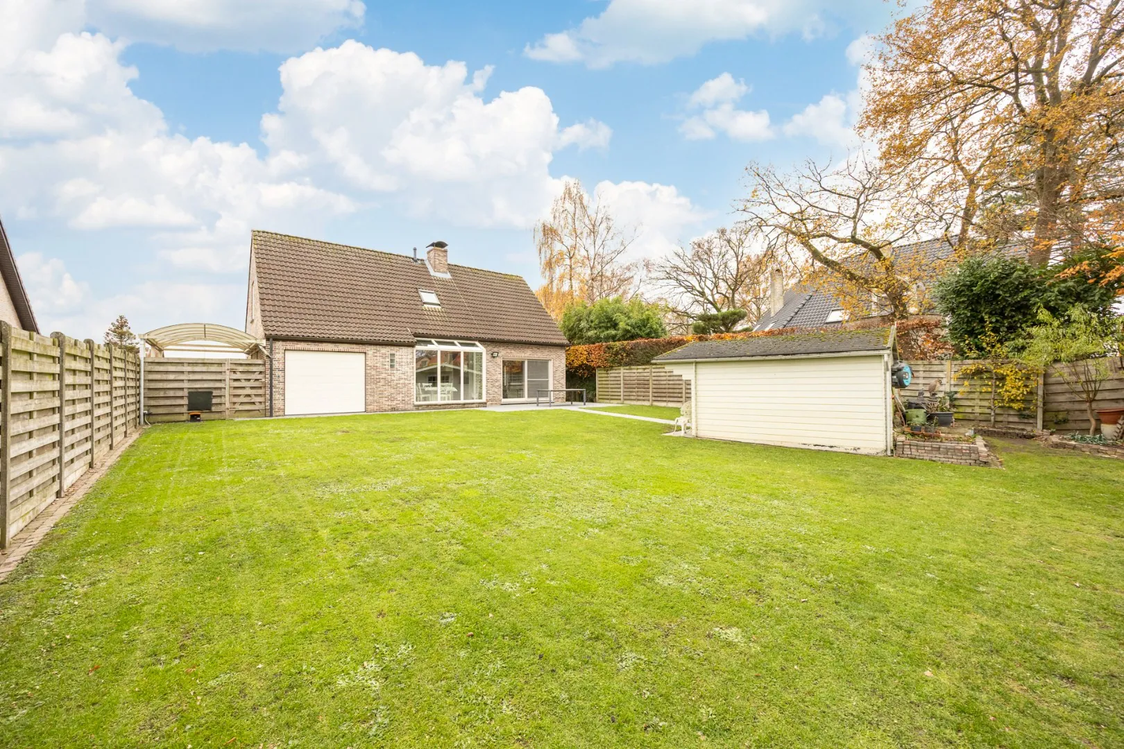 Buiten geniet u van een prachtig aangelegde, volledig omheinde tuin, waar rust en privacy centraal staan. De grote tuinberging biedt extra opbergruimte en langs ... de zijkant van de woning is er nog een extra carport.