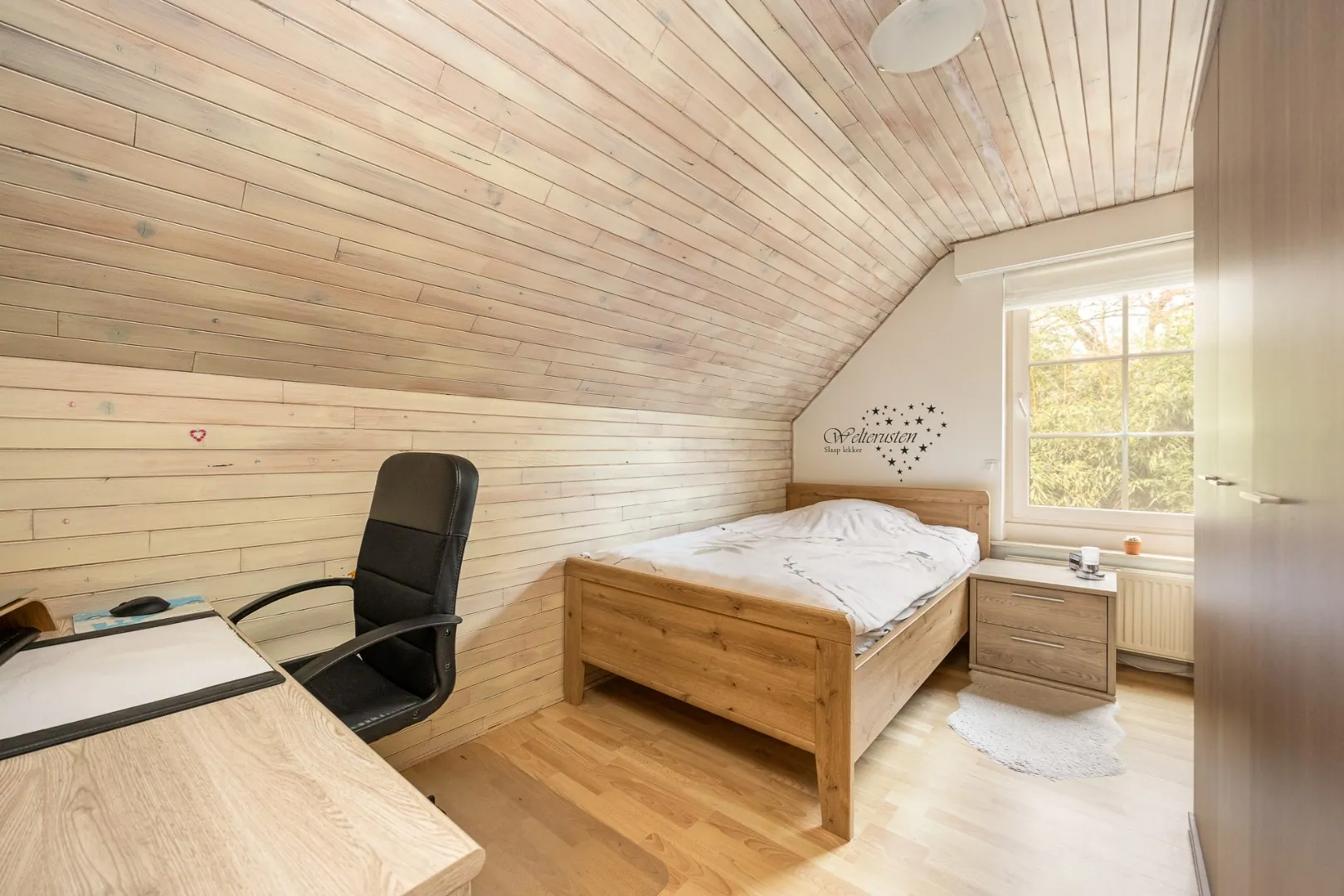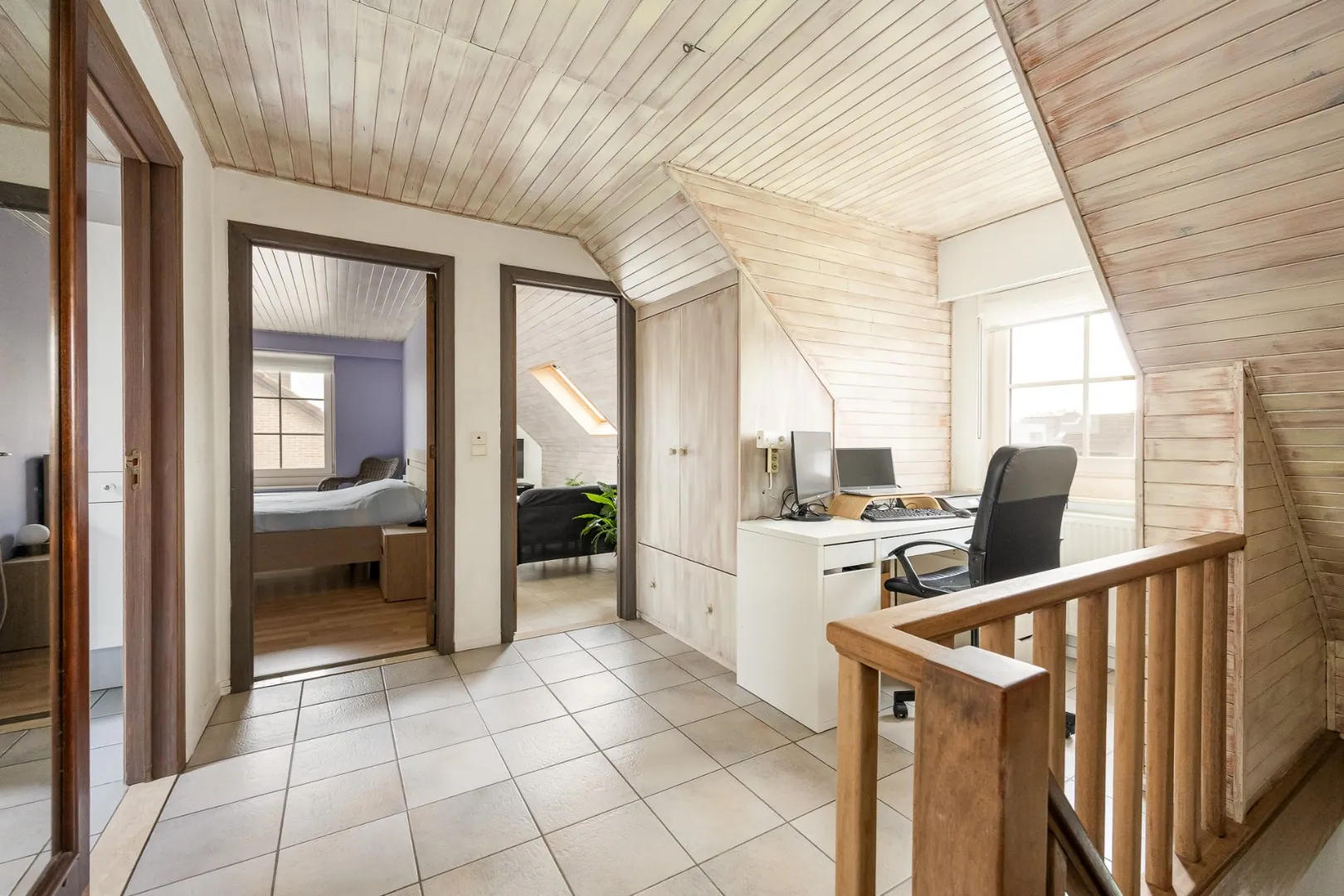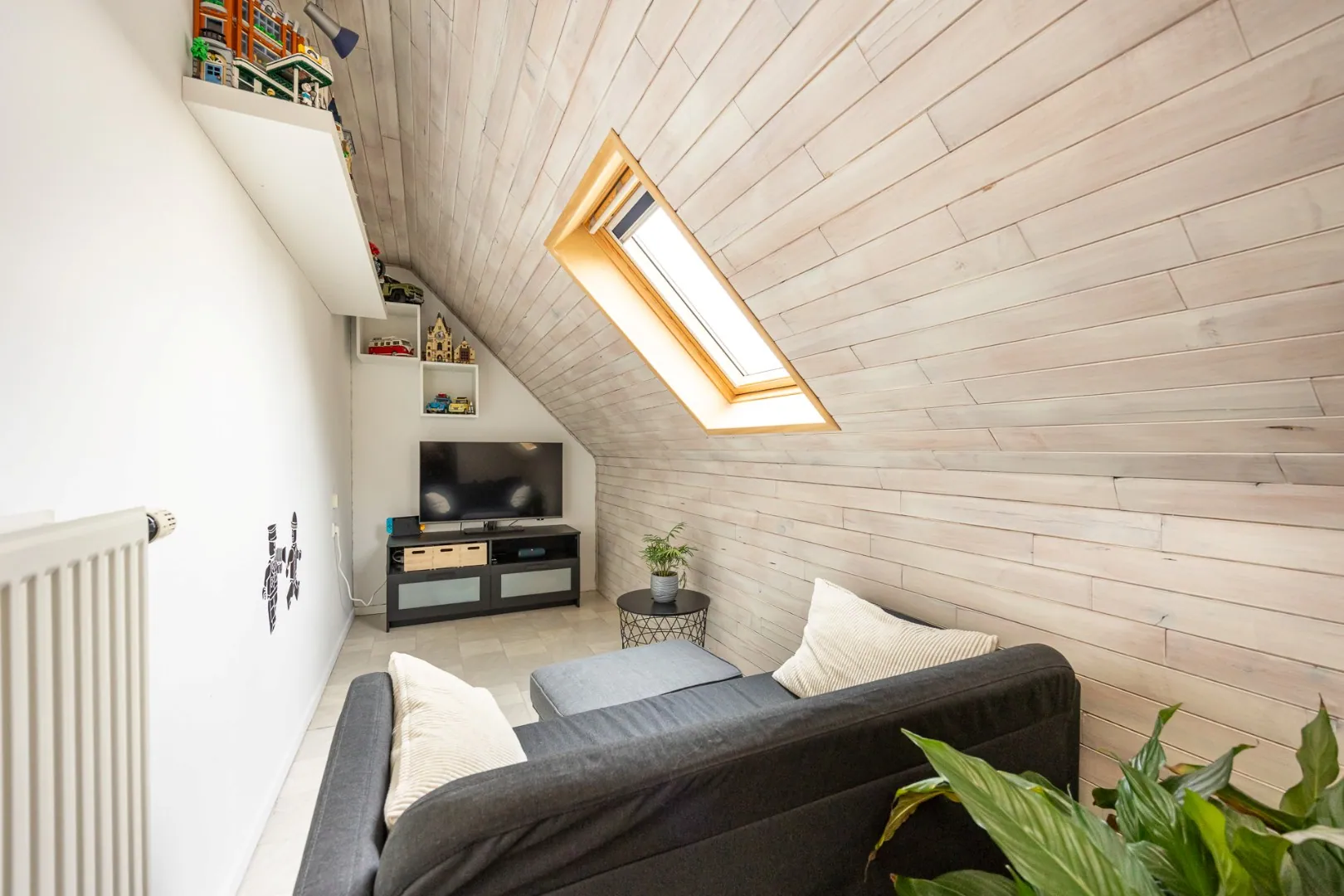 Op de verdieping bevinden zich drie volwaardige slaapkamers, een badkamer met ligbad én douche, en een extra kamer die momenteel dienstdoet als tv- of hobbykamer – perfect als speelkamer of bureau. Er is ook nog een opbergzolder bereikbaar via zoldertrap met luik.