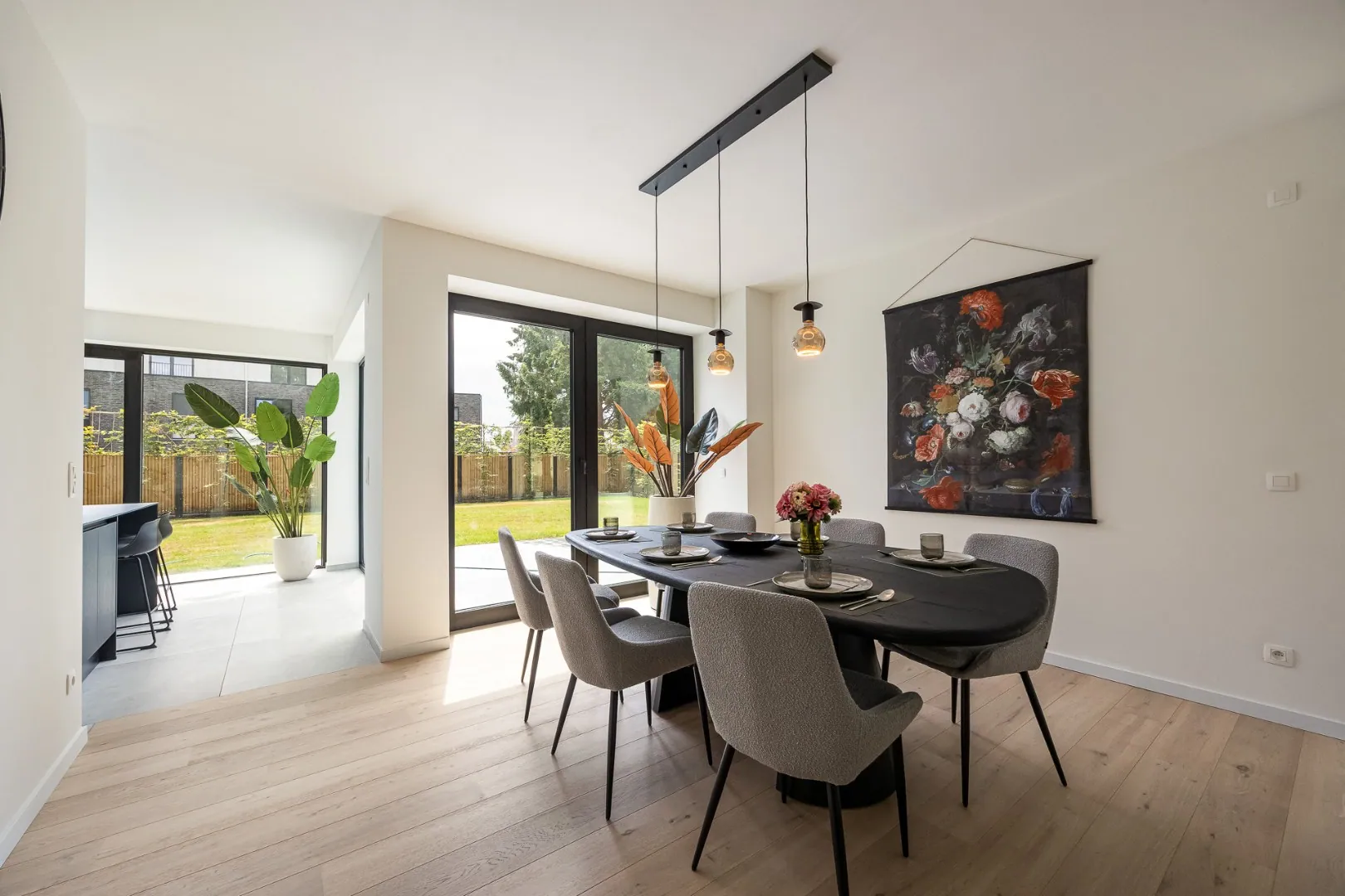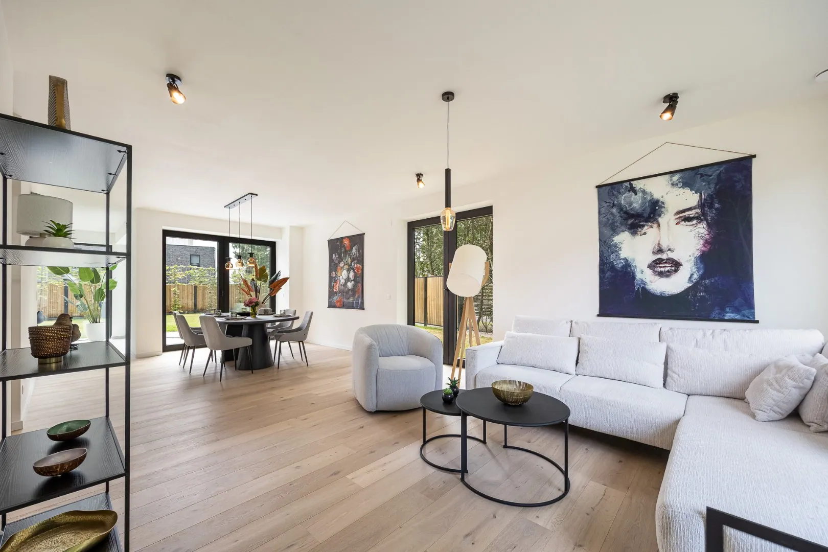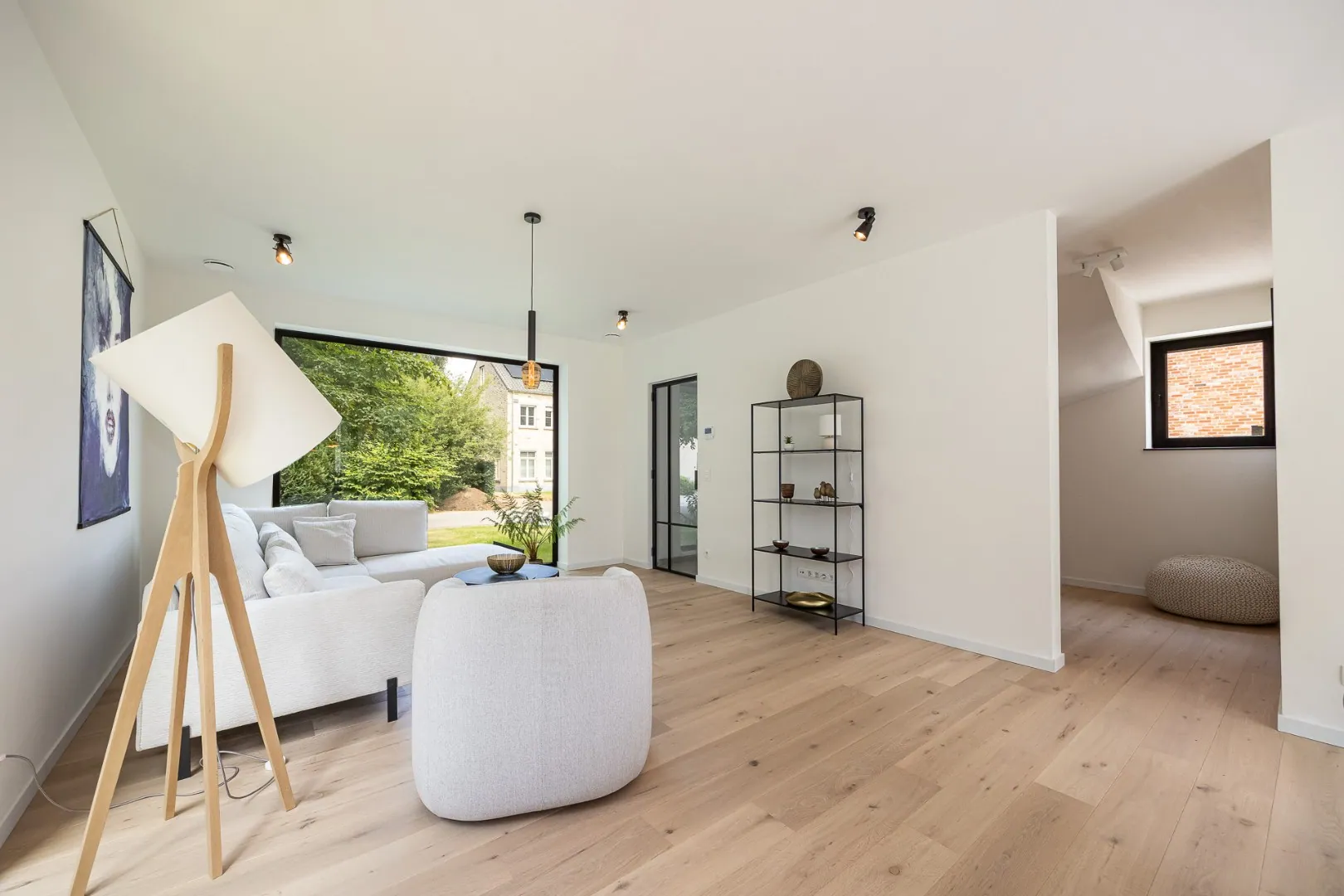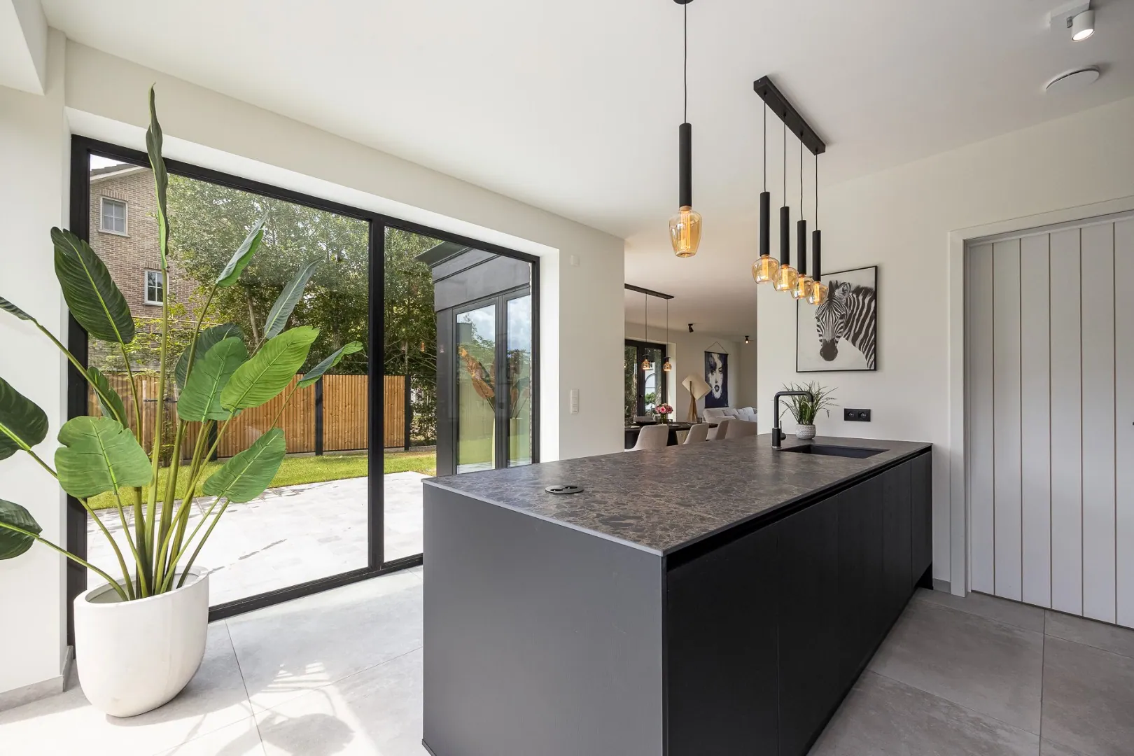 De leefkeuken vormt het hart van de woning — een gezellige plek met aperitiefhoek en grote schuifraam die rechtstreeks toegang geeft tot het zonovergoten terras en de tuin. De living sluit hier harmonieus op aan, net als de praktische berging.