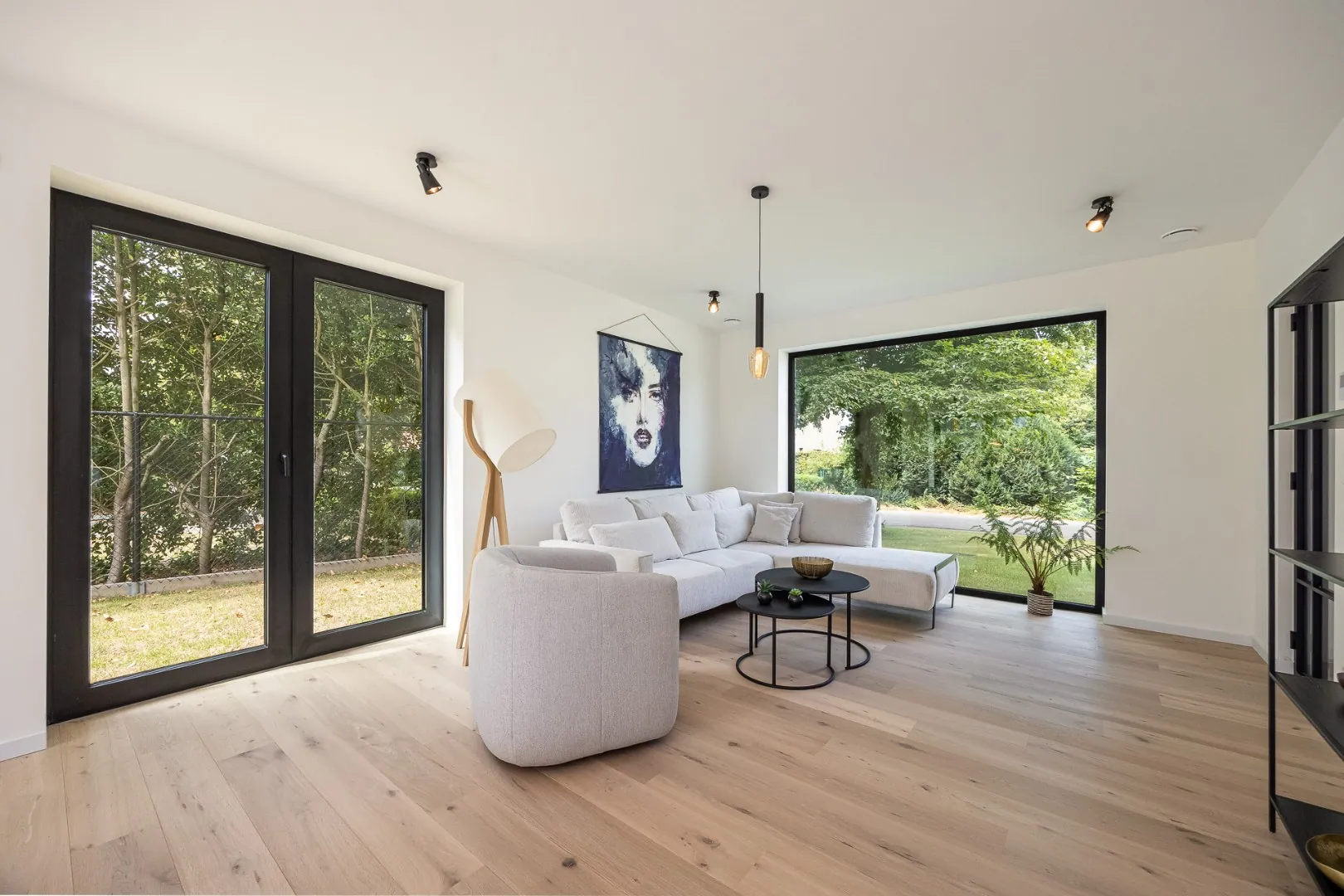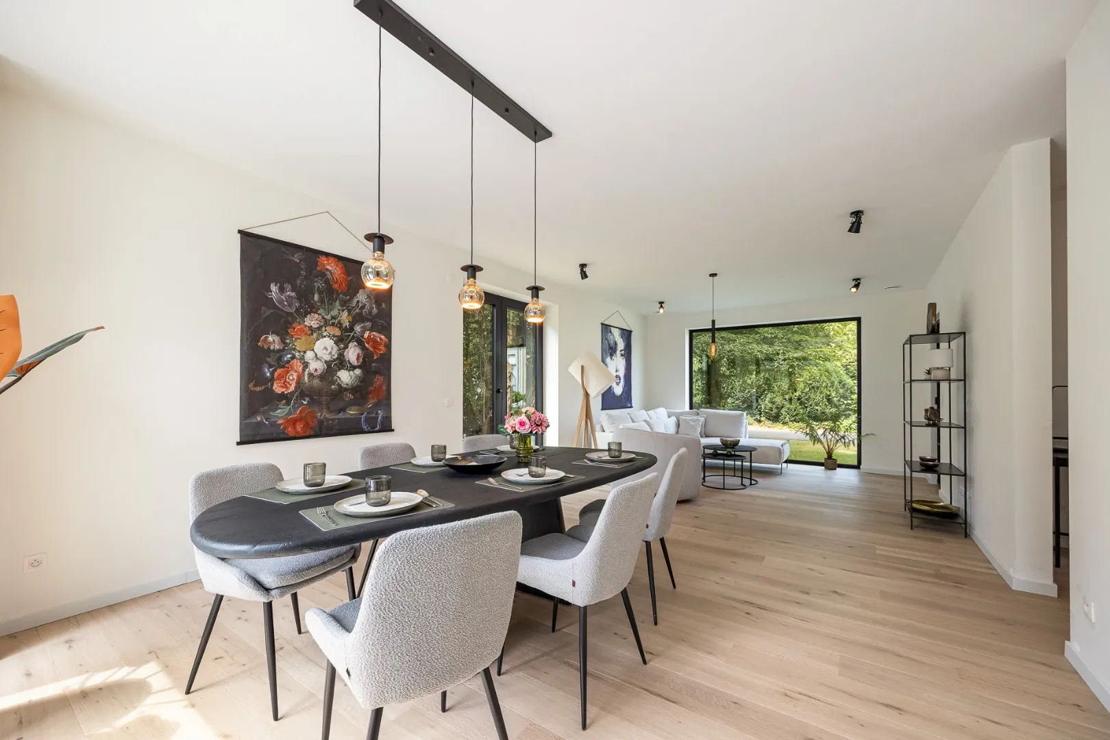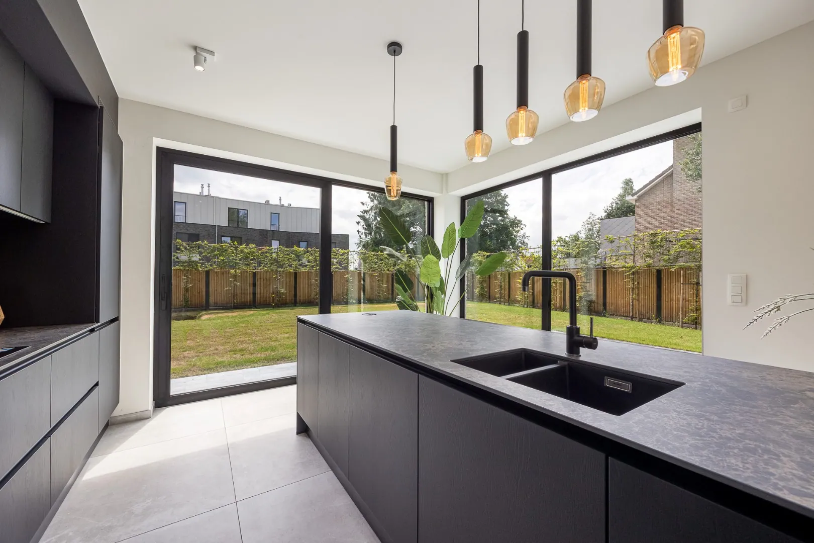 De leefkeuken vormt het hart van de woning — een gezellige plek met aperitiefhoek en grote schuifraam die rechtstreeks toegang geeft tot het zonovergoten terras en de tuin. De living sluit hier harmonieus op aan, net als de praktische berging.