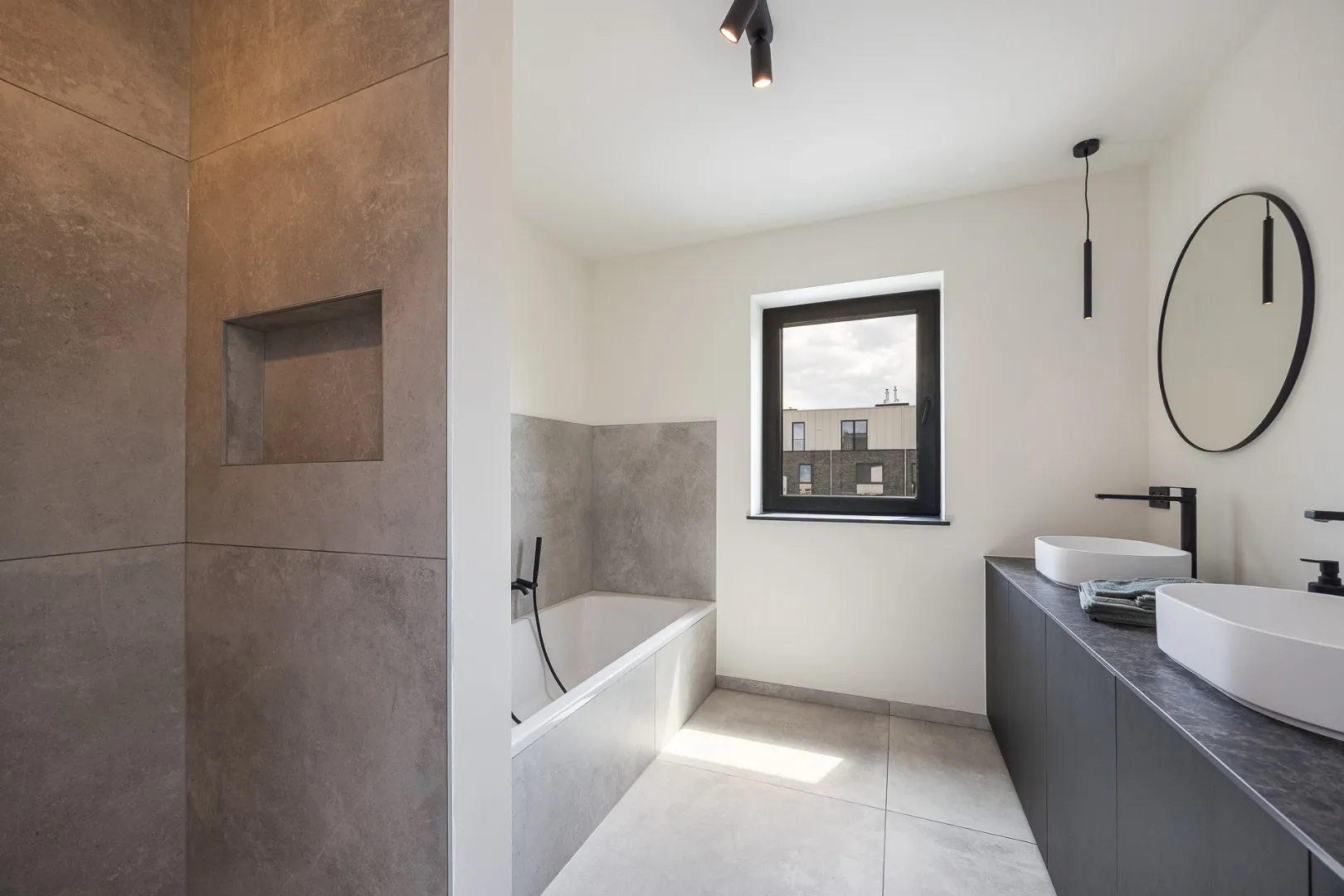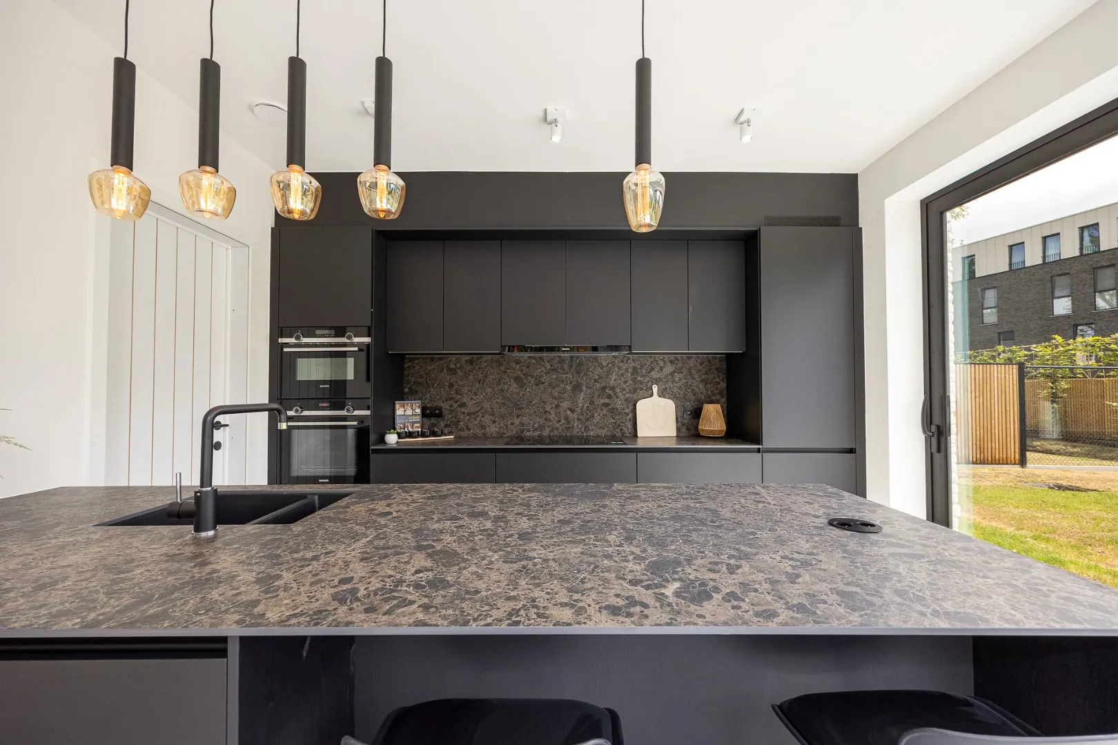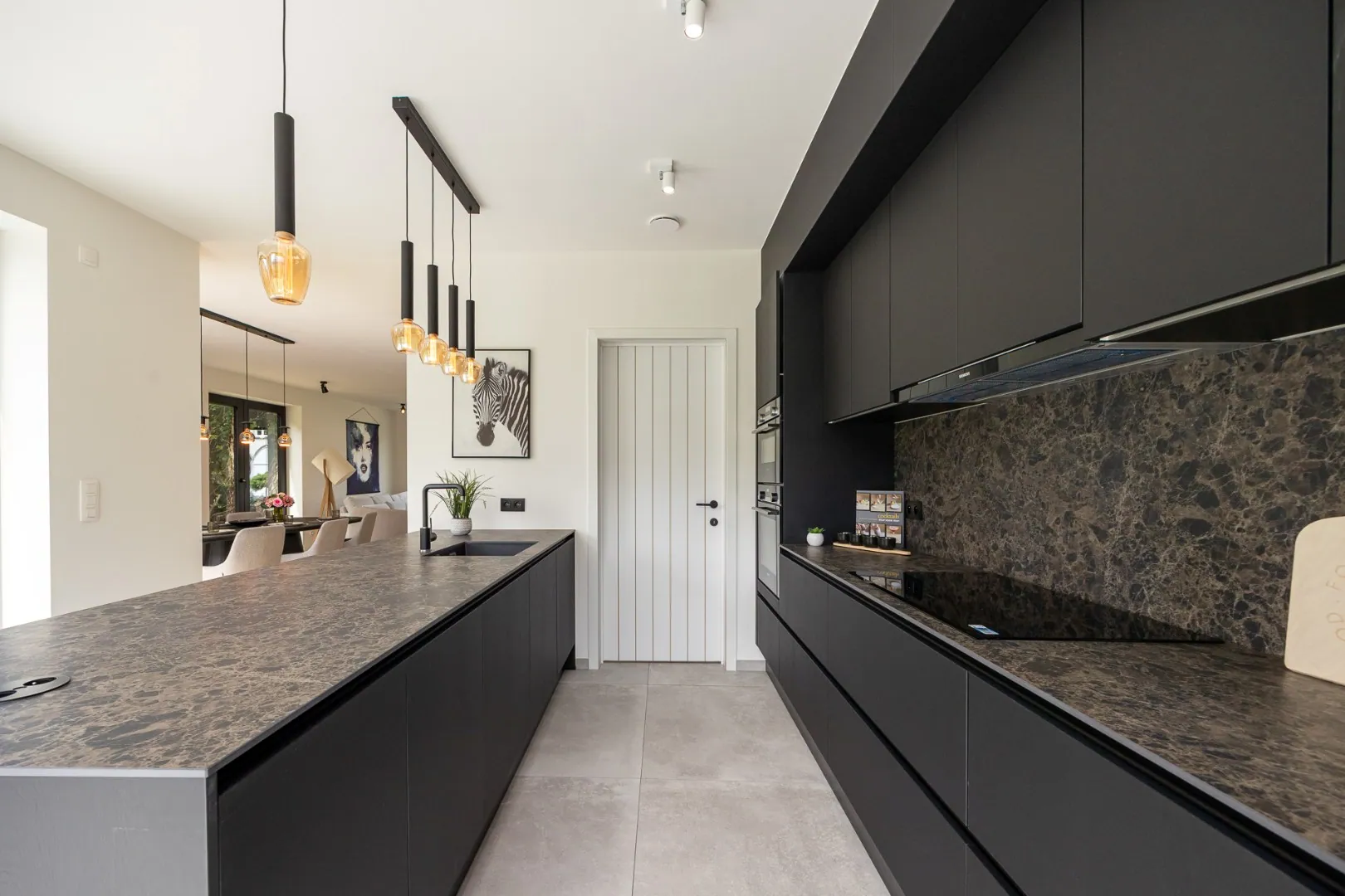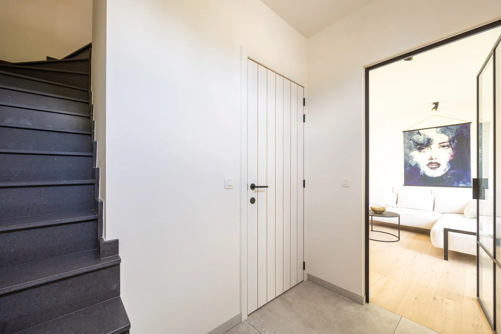 De leefkeuken vormt het hart van de woning — een gezellige plek met aperitiefhoek en grote schuifraam die rechtstreeks toegang geeft tot het zonovergoten terras en de tuin. De living sluit hier harmonieus op aan, net als de praktische berging.