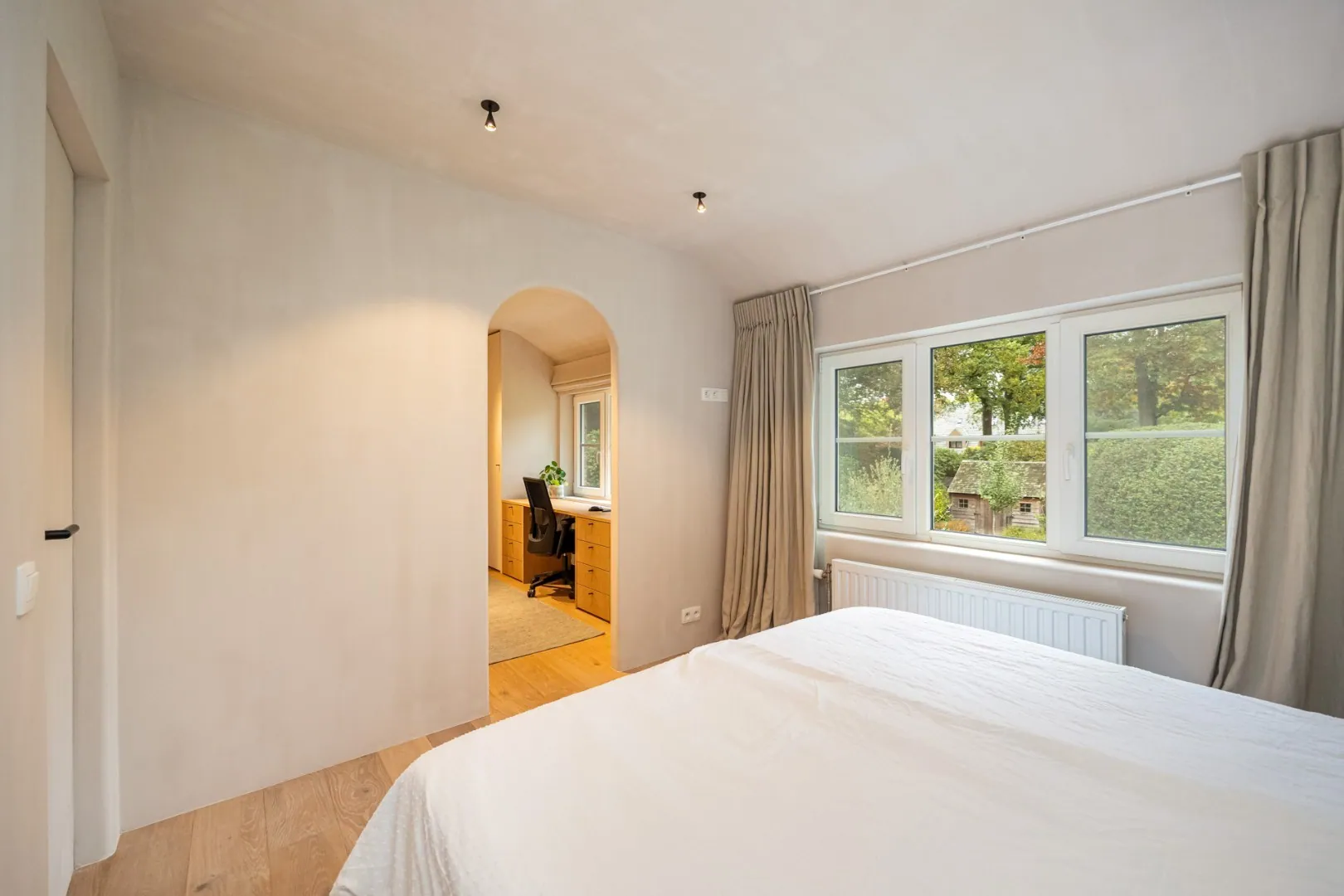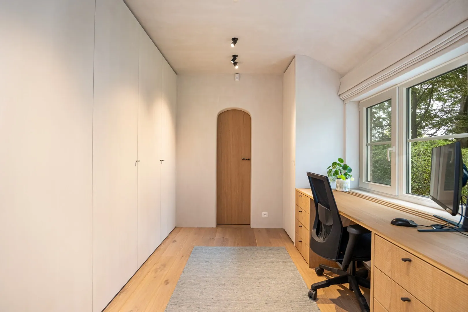 Aansluitend bevindt zich een TV-kamer of bureauruimte met grote raam en zicht op de tuin.