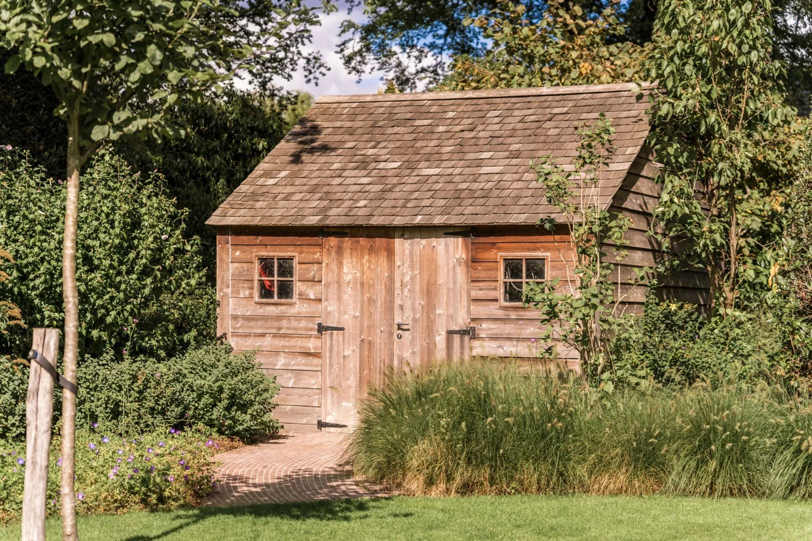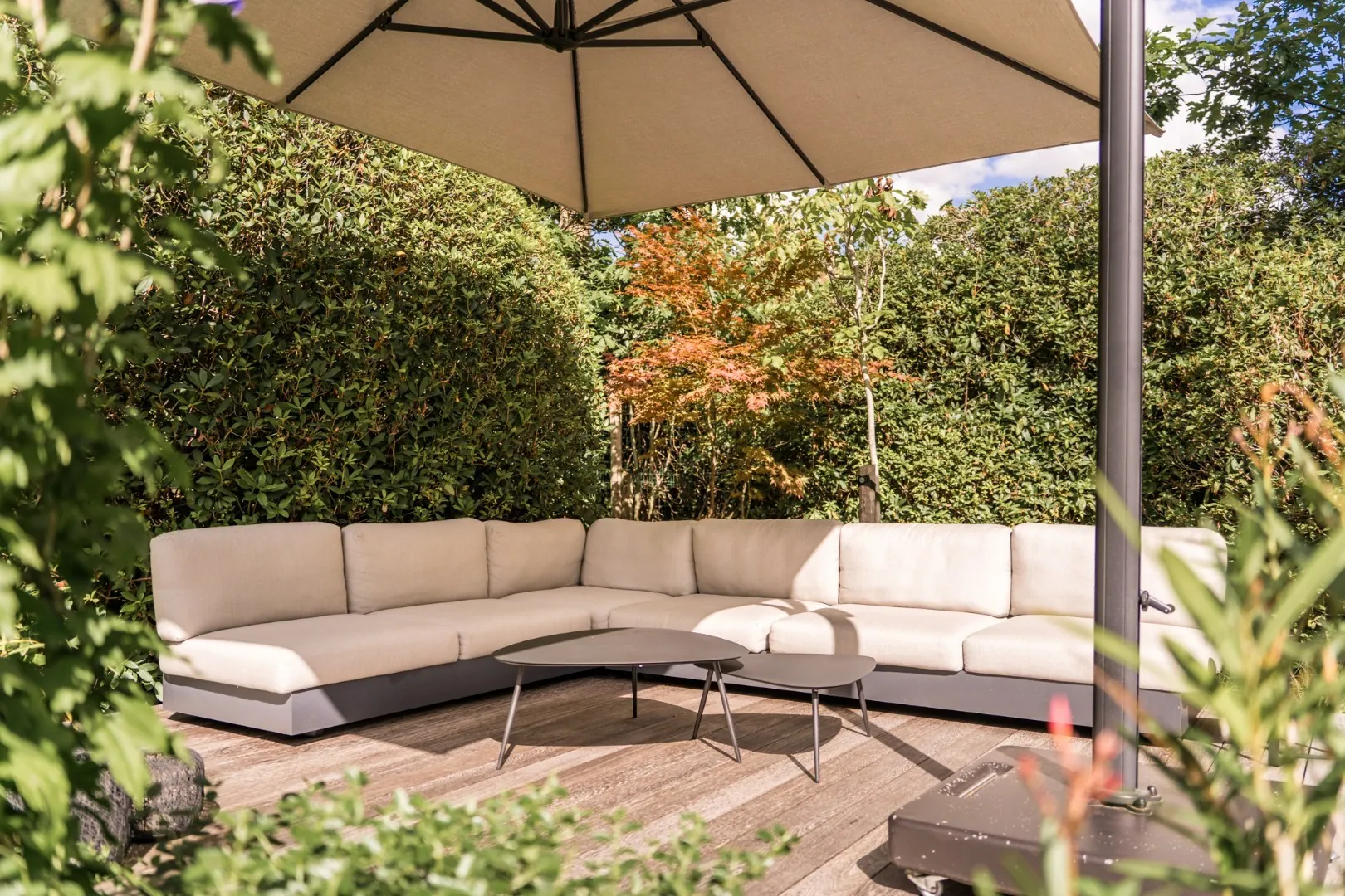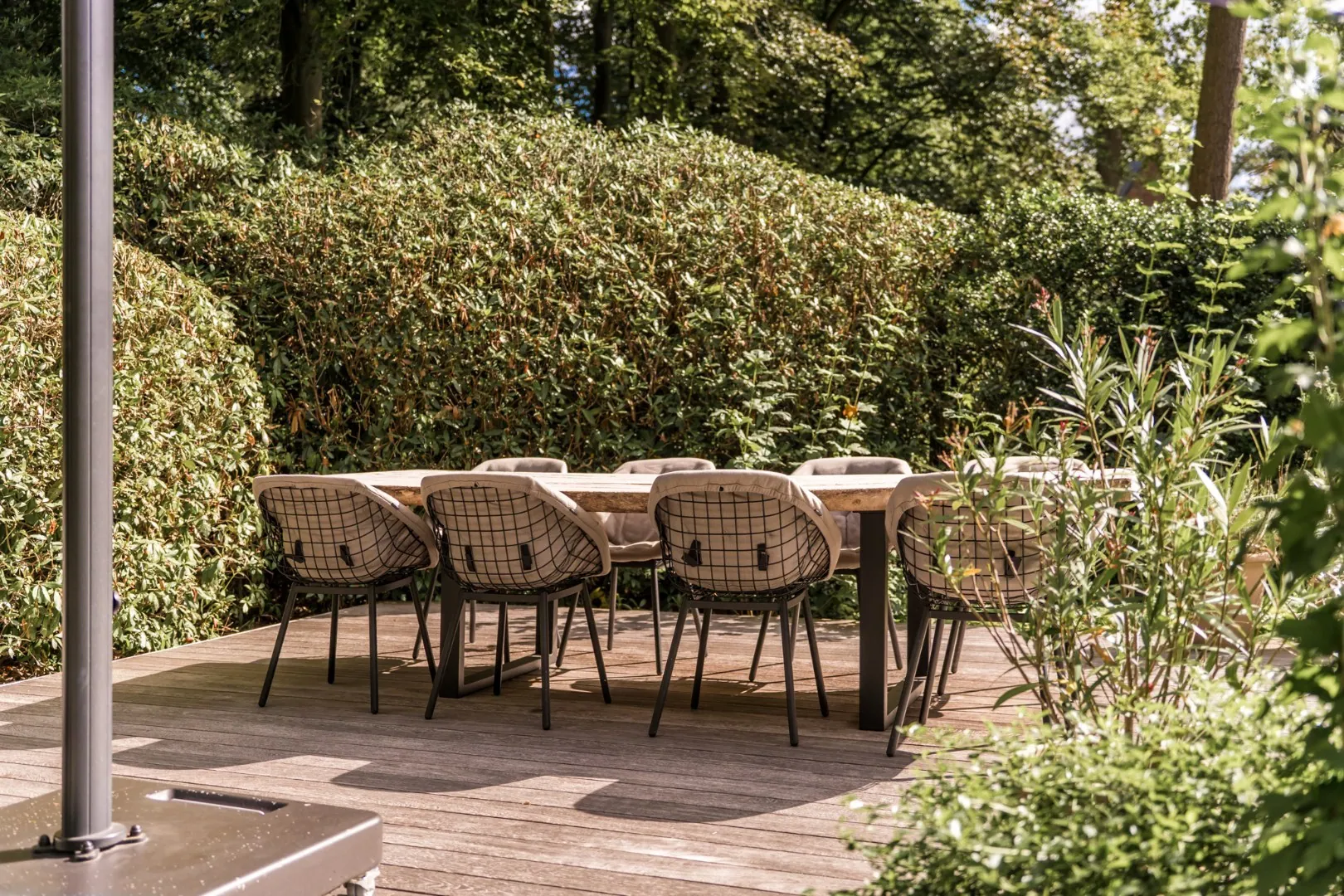 Achteraan vind je een ruim terras in blauwe hardsteen en klinkers, een zonneplatform van 32 m² en een houten bijgebouw/berging. Verder is de tuin ook voorzien van beregeningsinstallatie.
