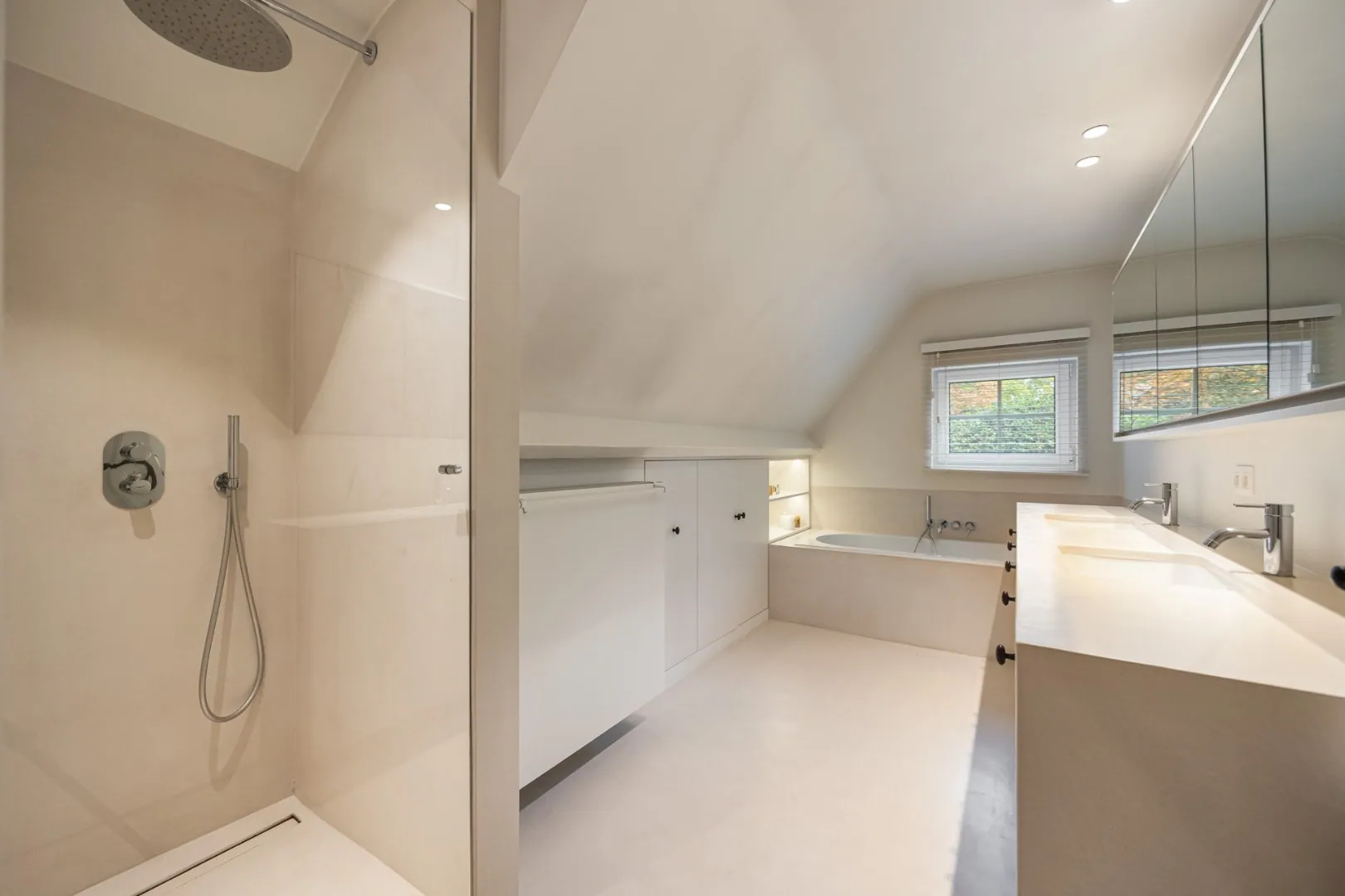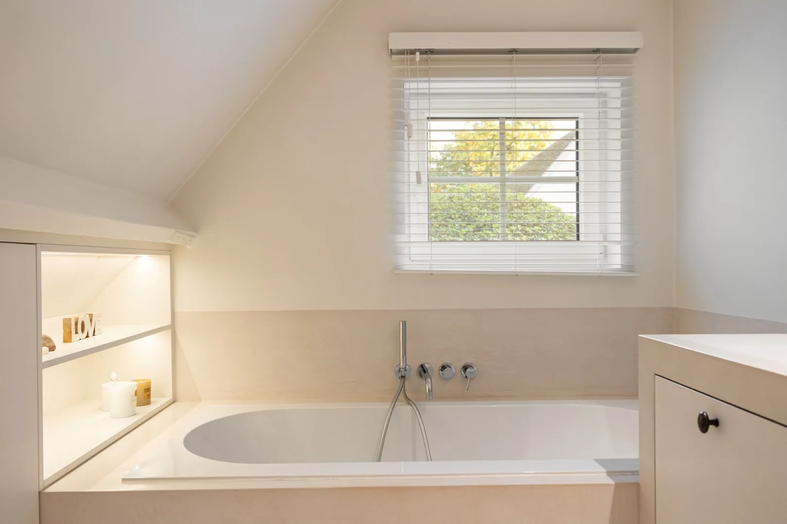 Een volwaardige badkamer met ligbad, douche, dubbele wastafel en maatwerk