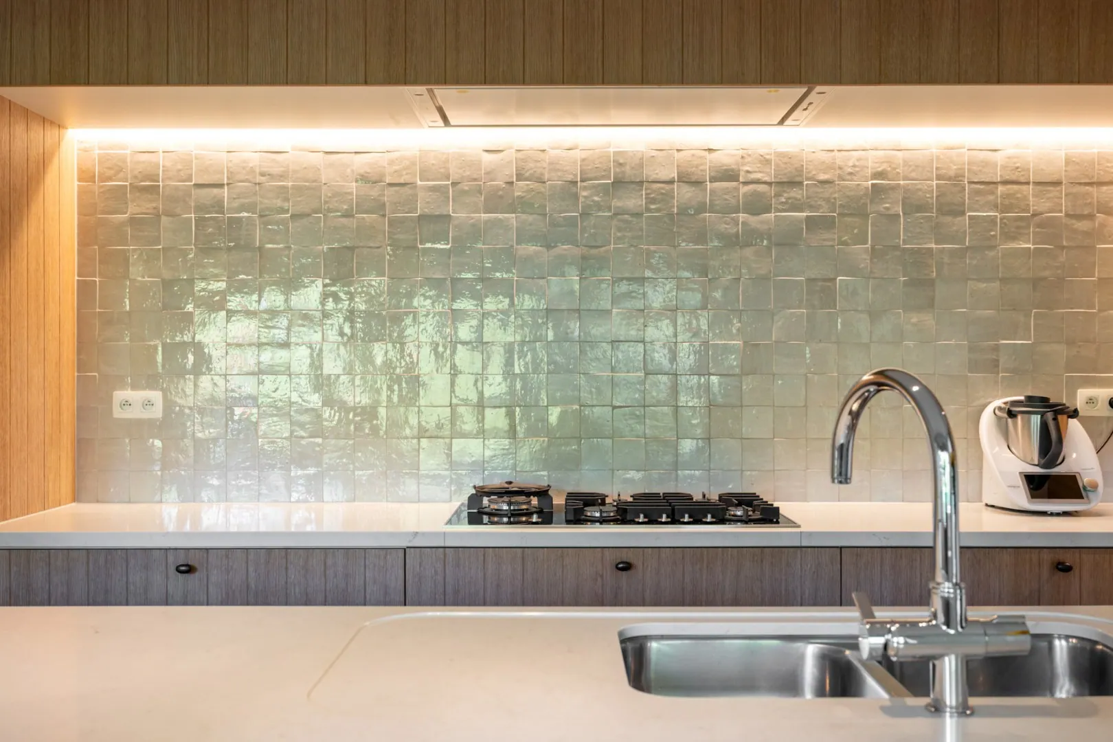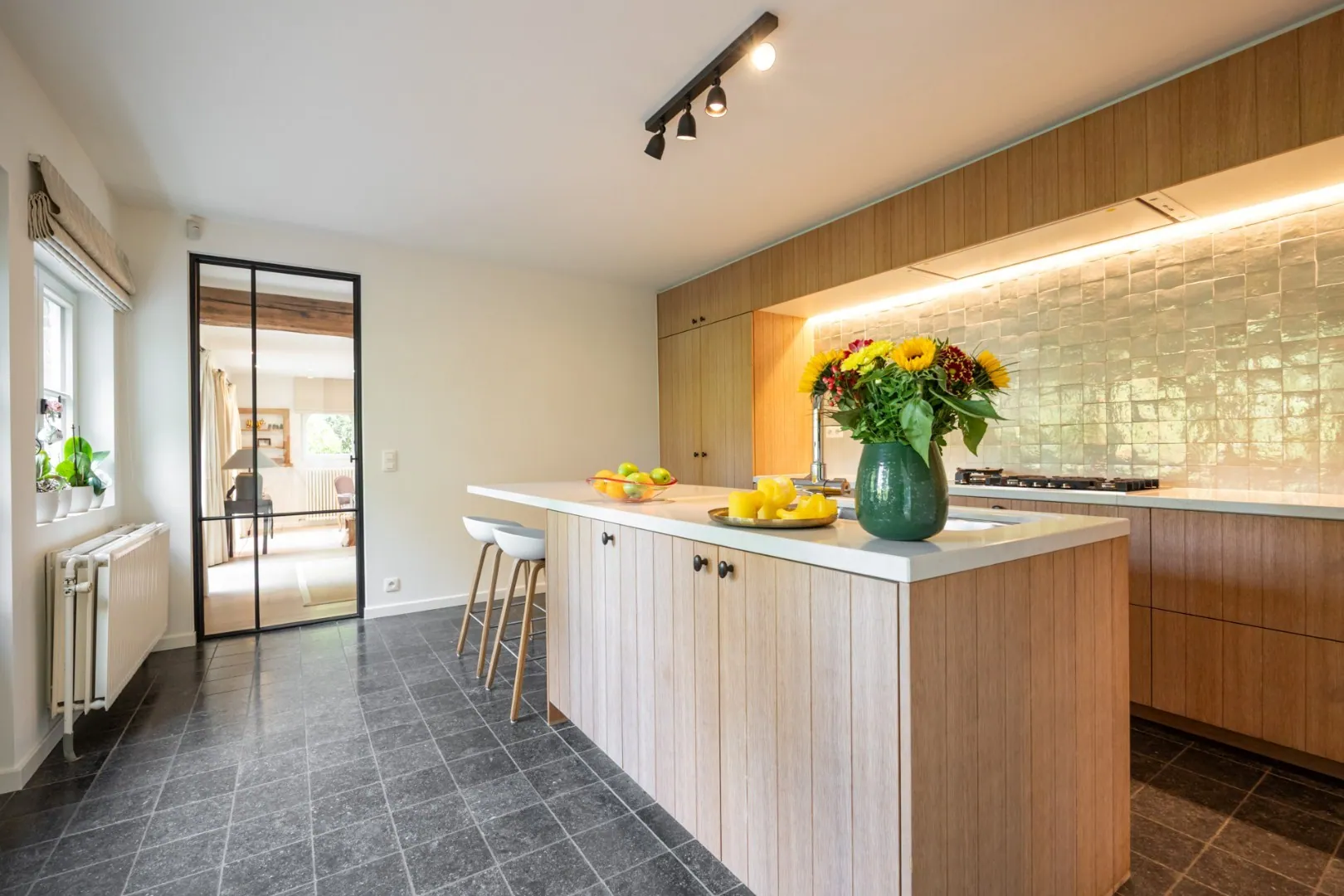 - Maatwerk kastenwand en centraal kookeiland met spoelbak, kokendwaterkraan en ontbijthoek