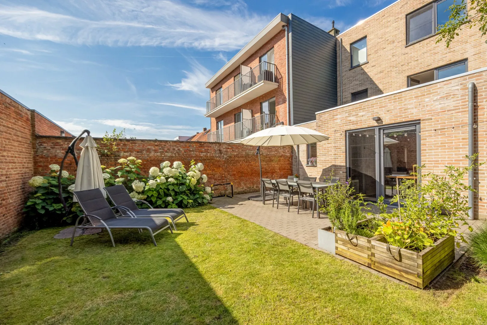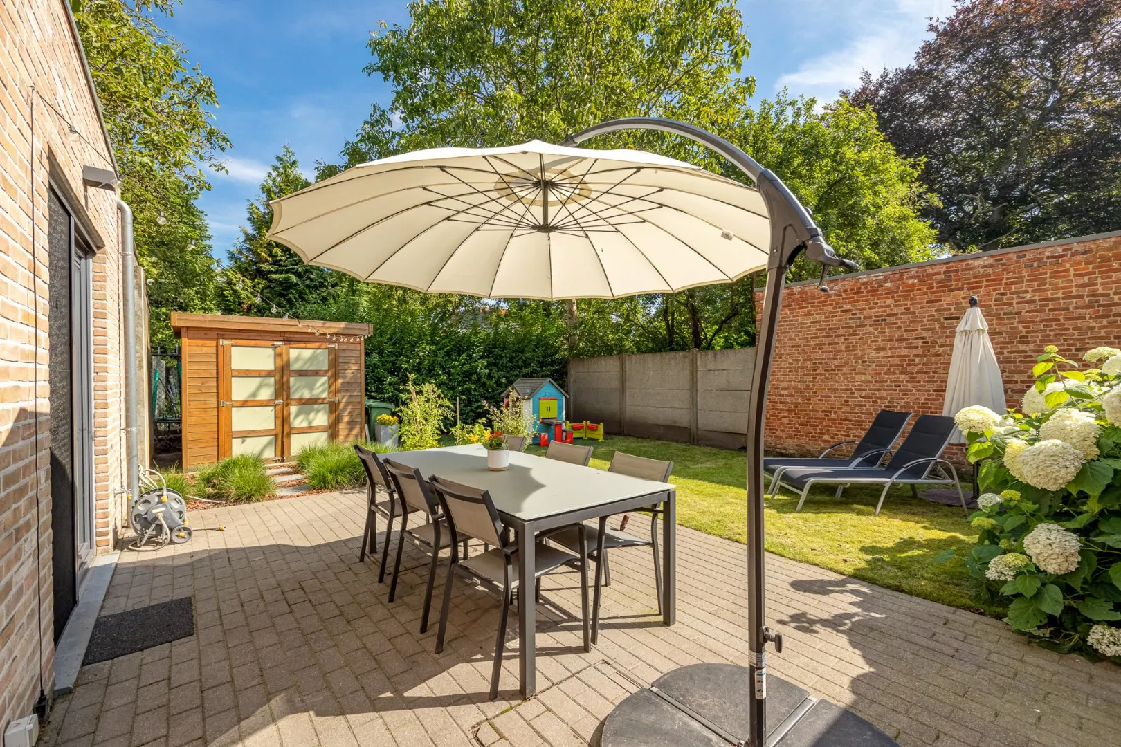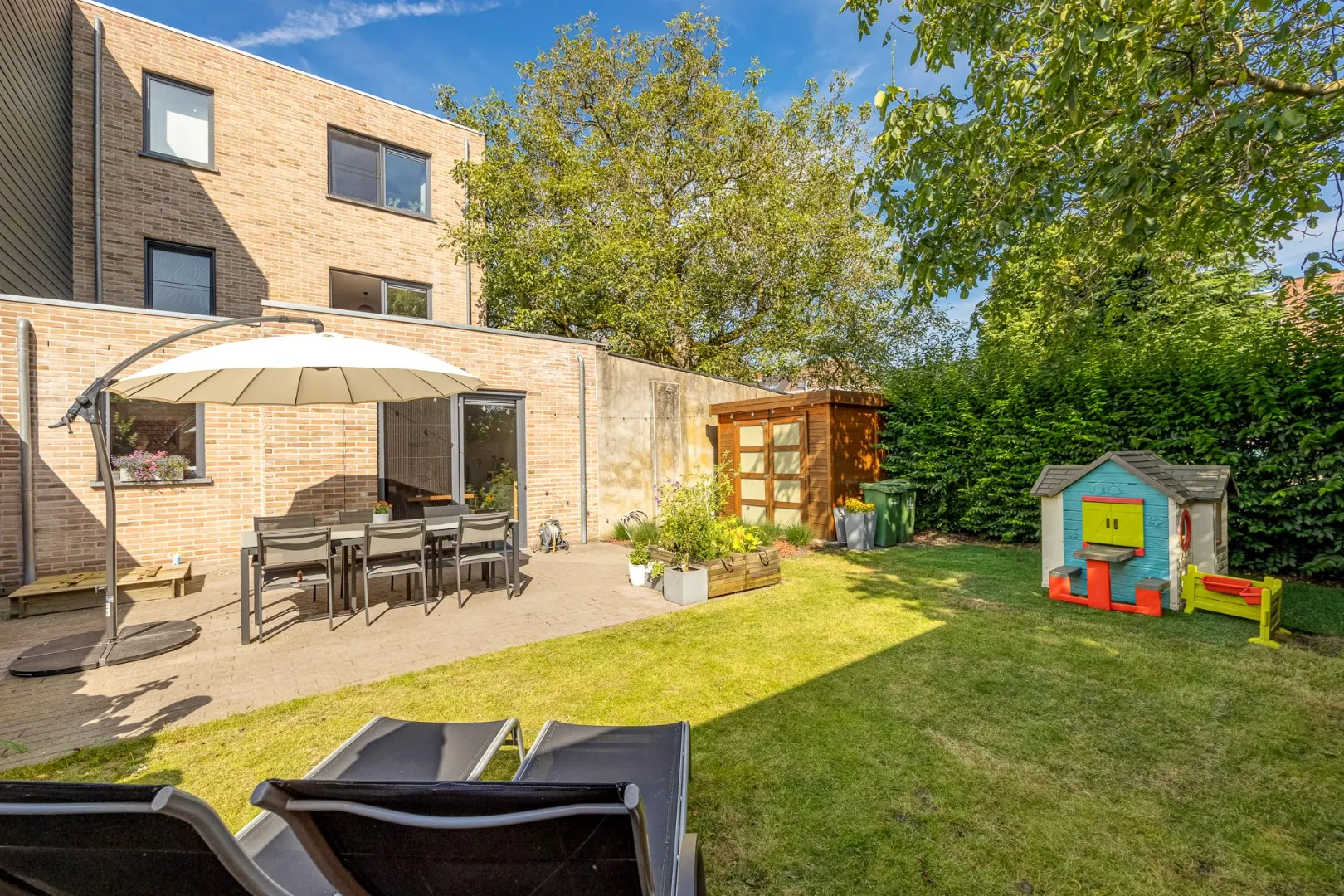 Via de dubbele raampartij betreedt men de mooi aangelegde tuin met terras en tuinberging waar men volledig tot rust kan komen.